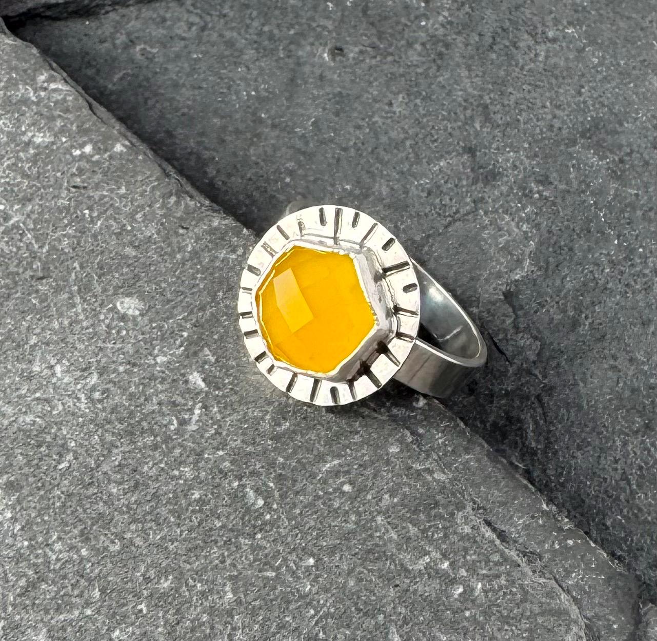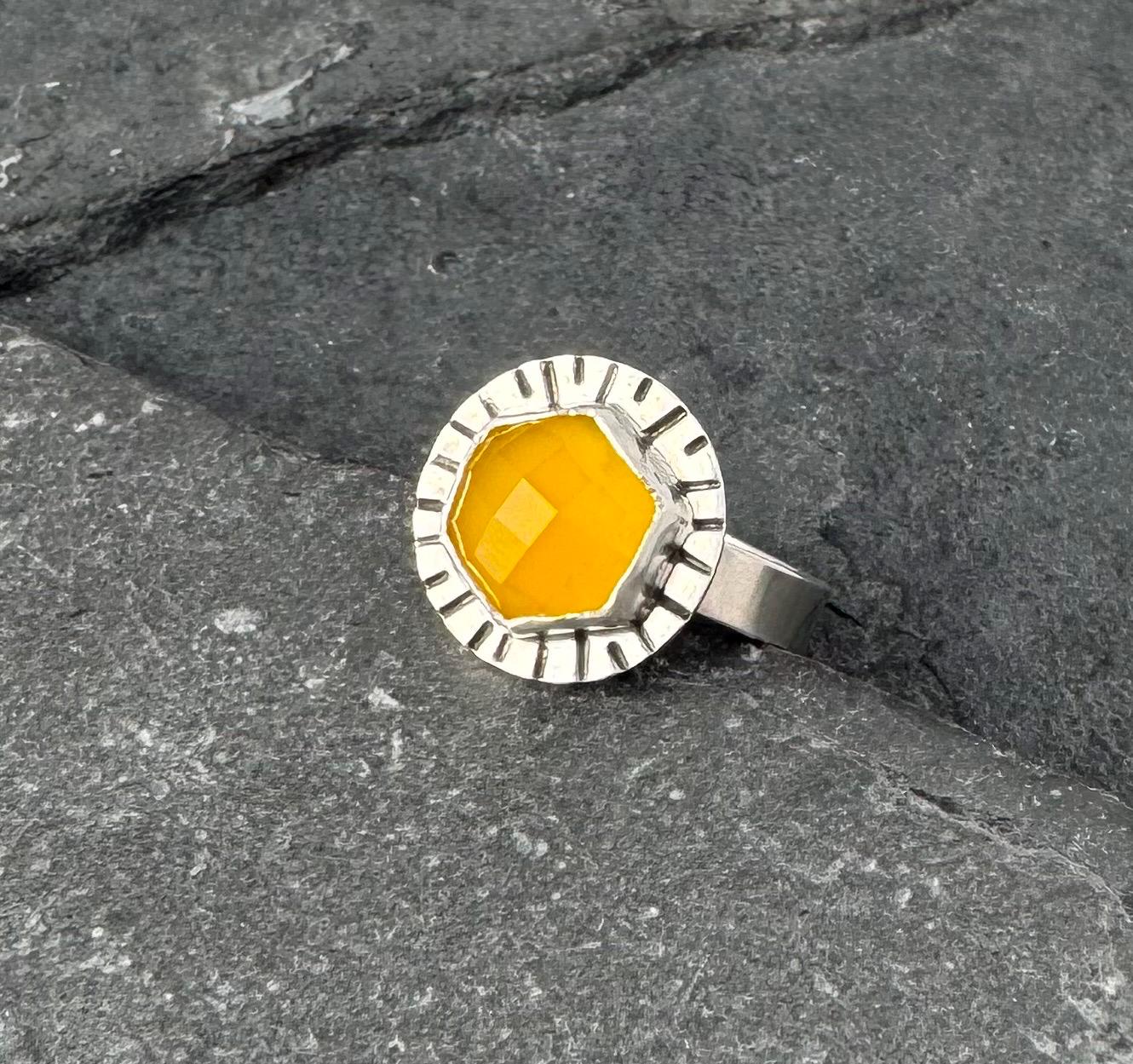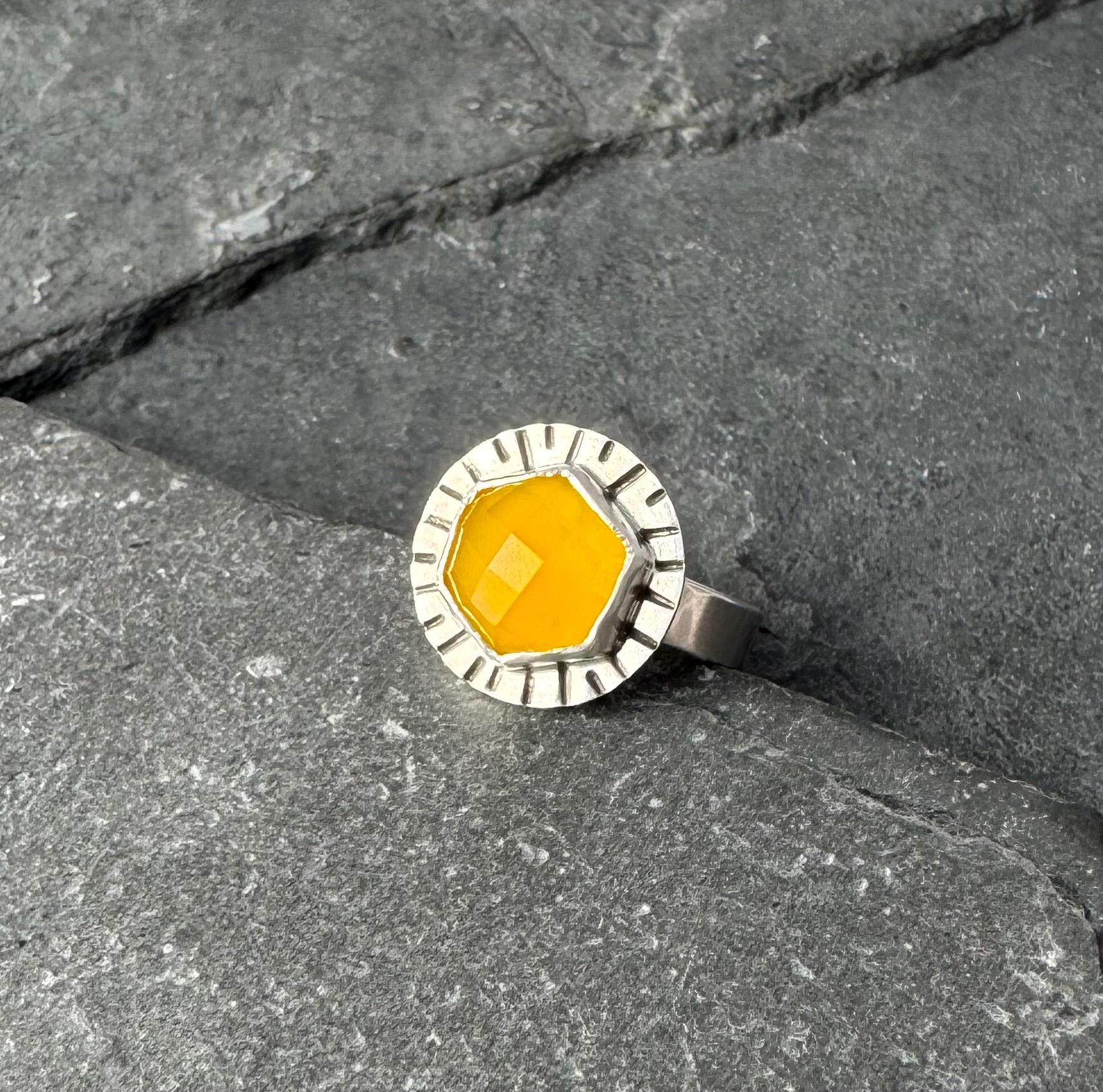 This sunny gemstone ring features a beautiful yellow onyx stone set in solid sterling silver. The gem is 10mm across, and the sterling silver stamped disc is 17mm (5/8").