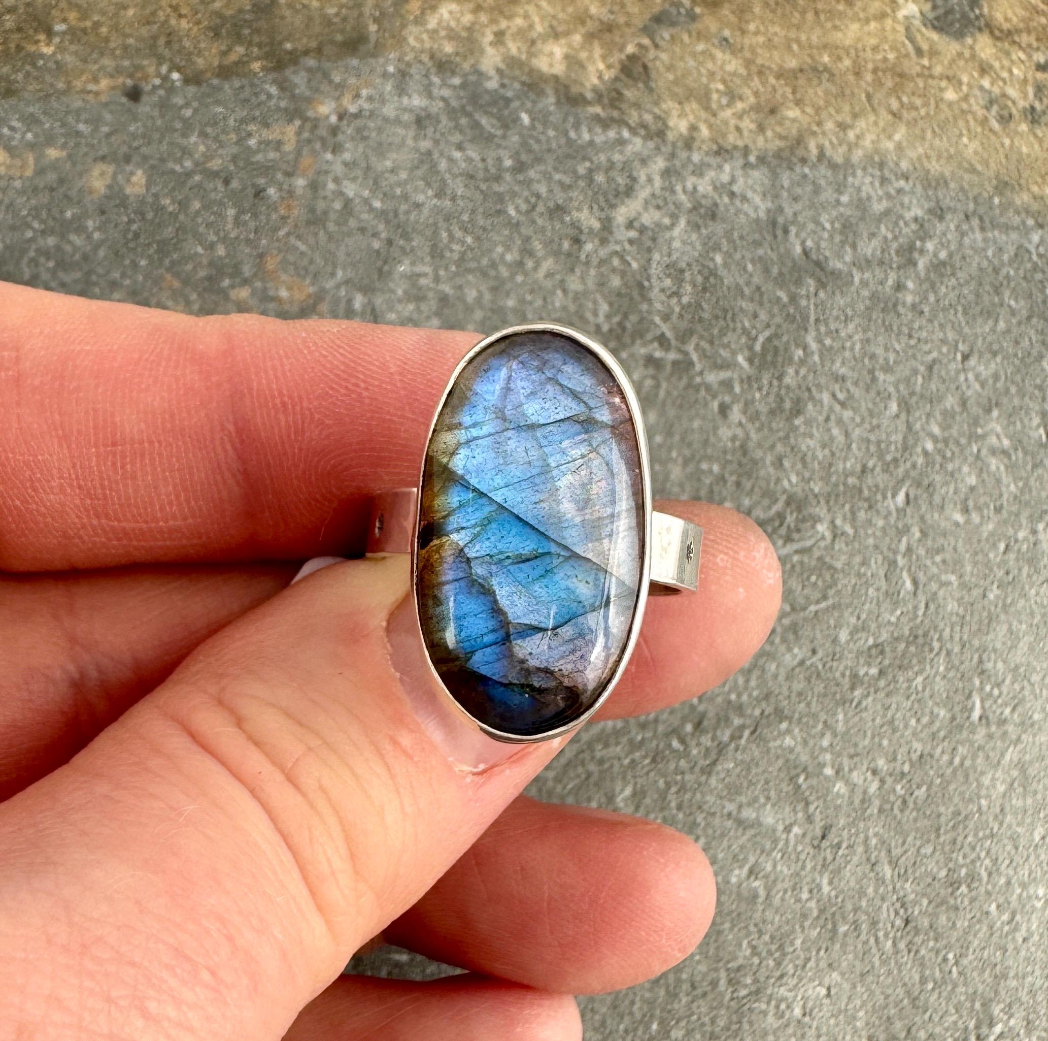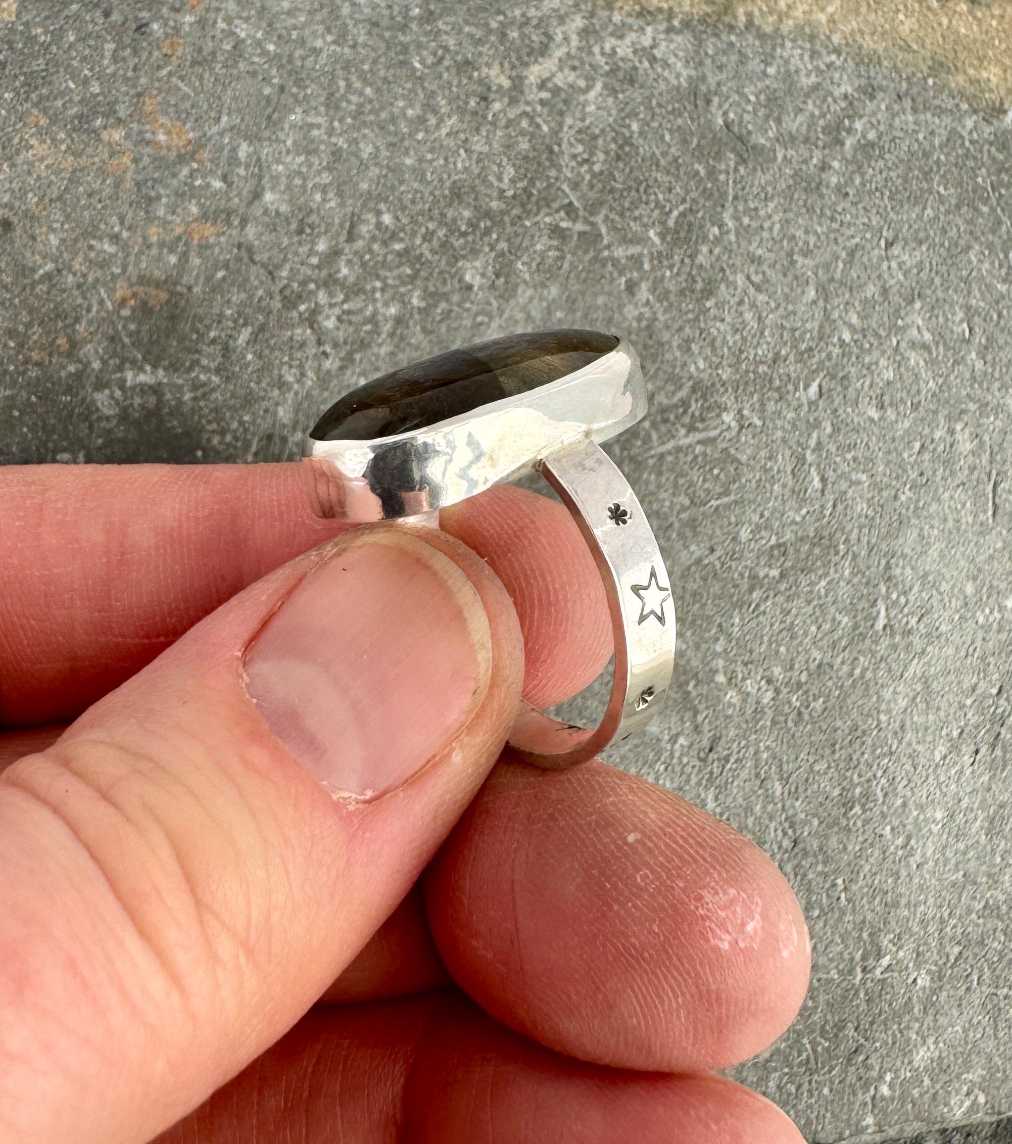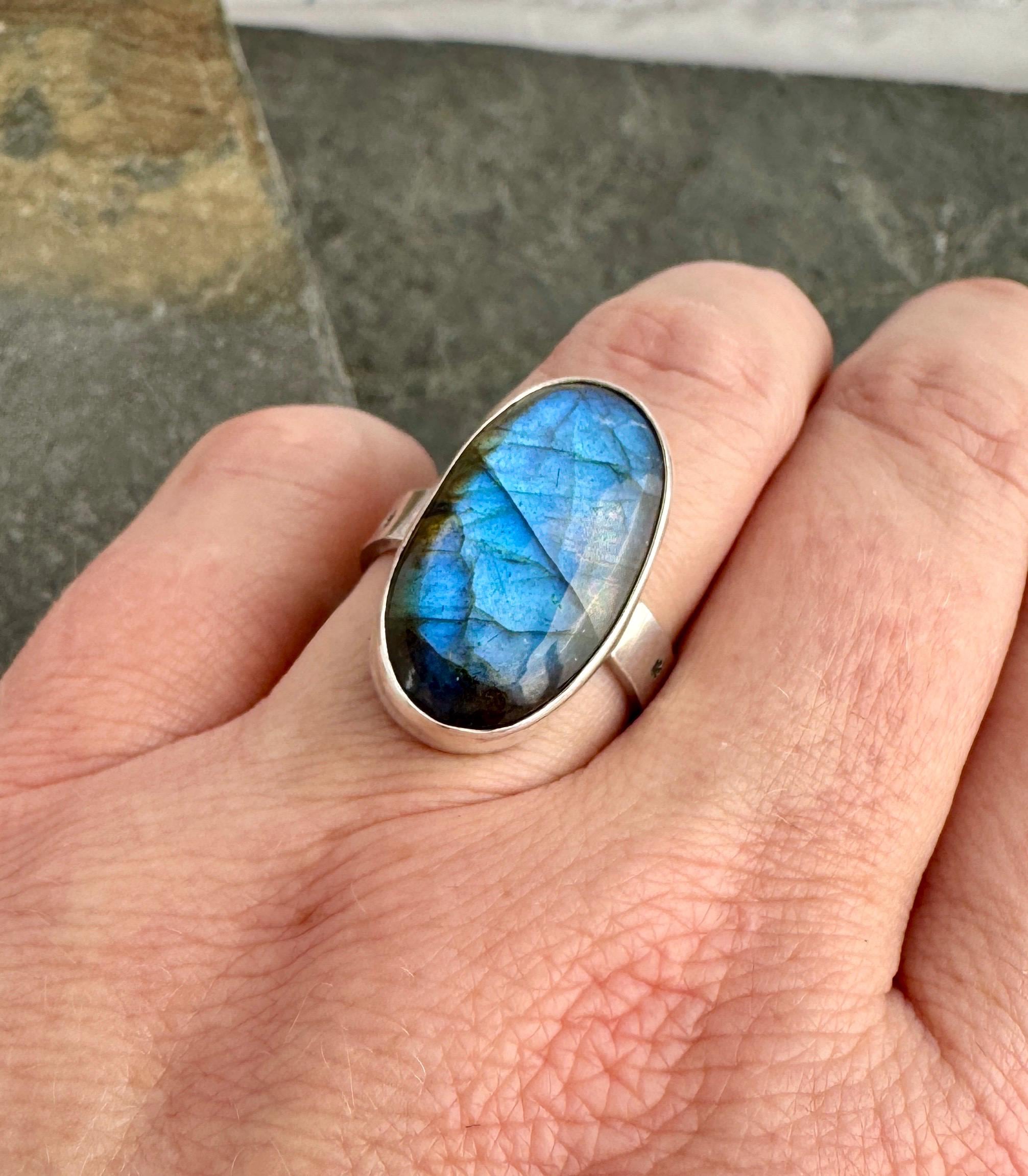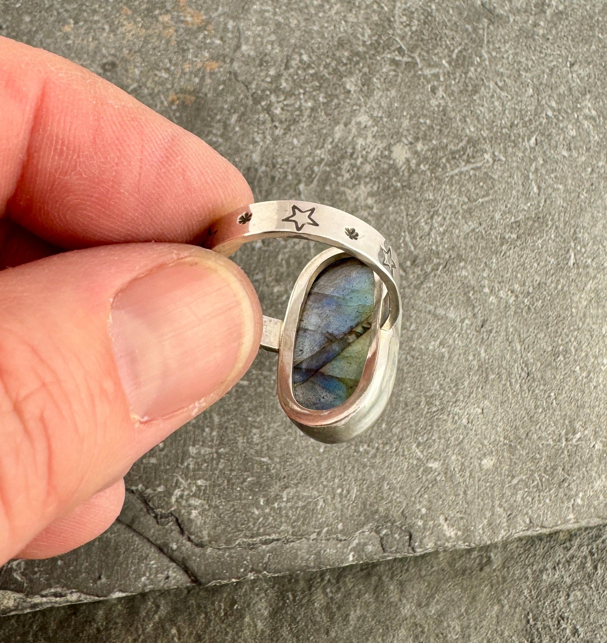 This large labradorite ring is full of beautiful blue flash. The stone is set in solid fine and sterling silver. The band is stamped with stars, complimenting the flashy deep blue color of the labradorite.