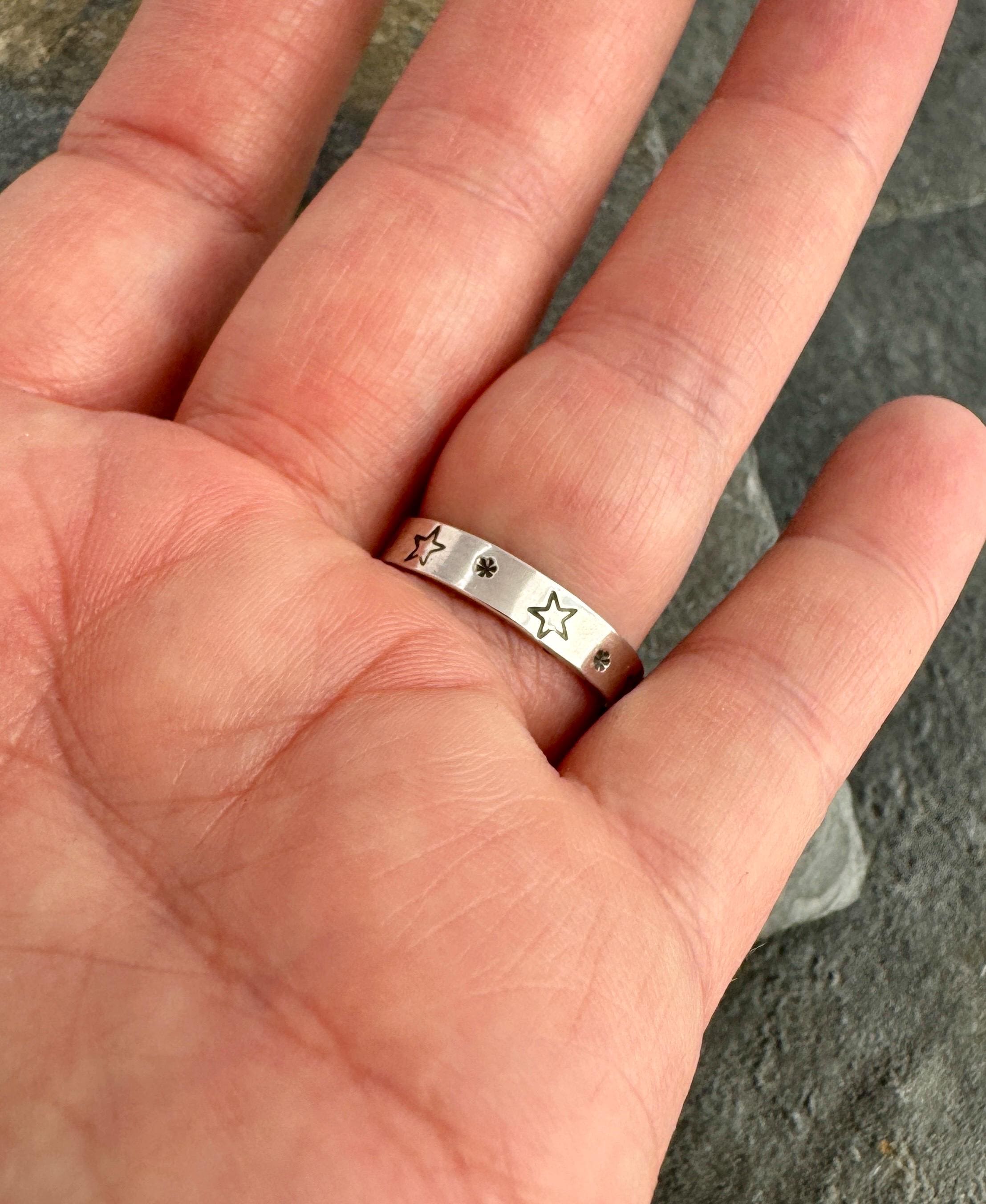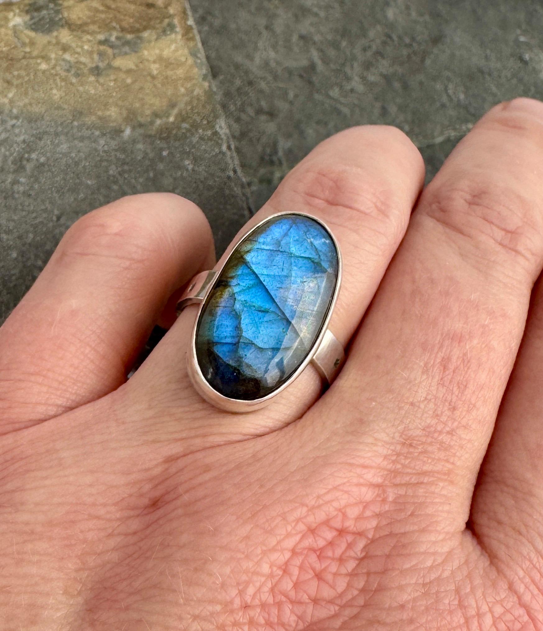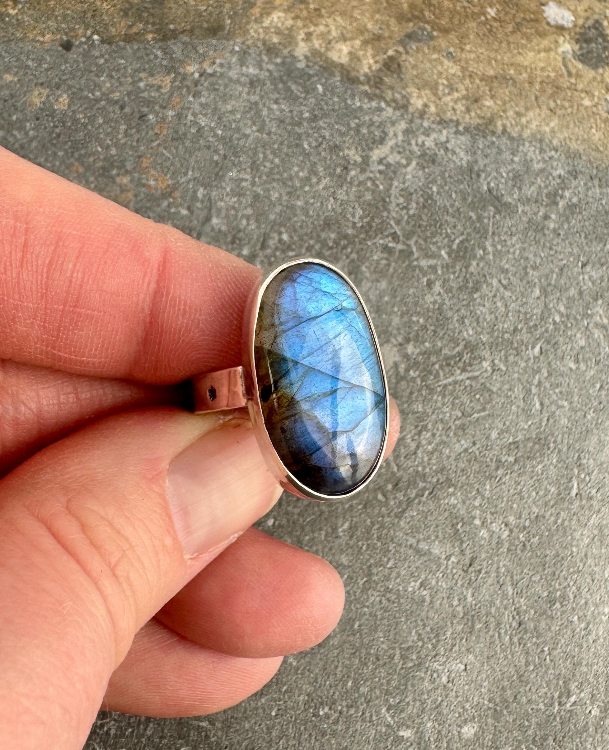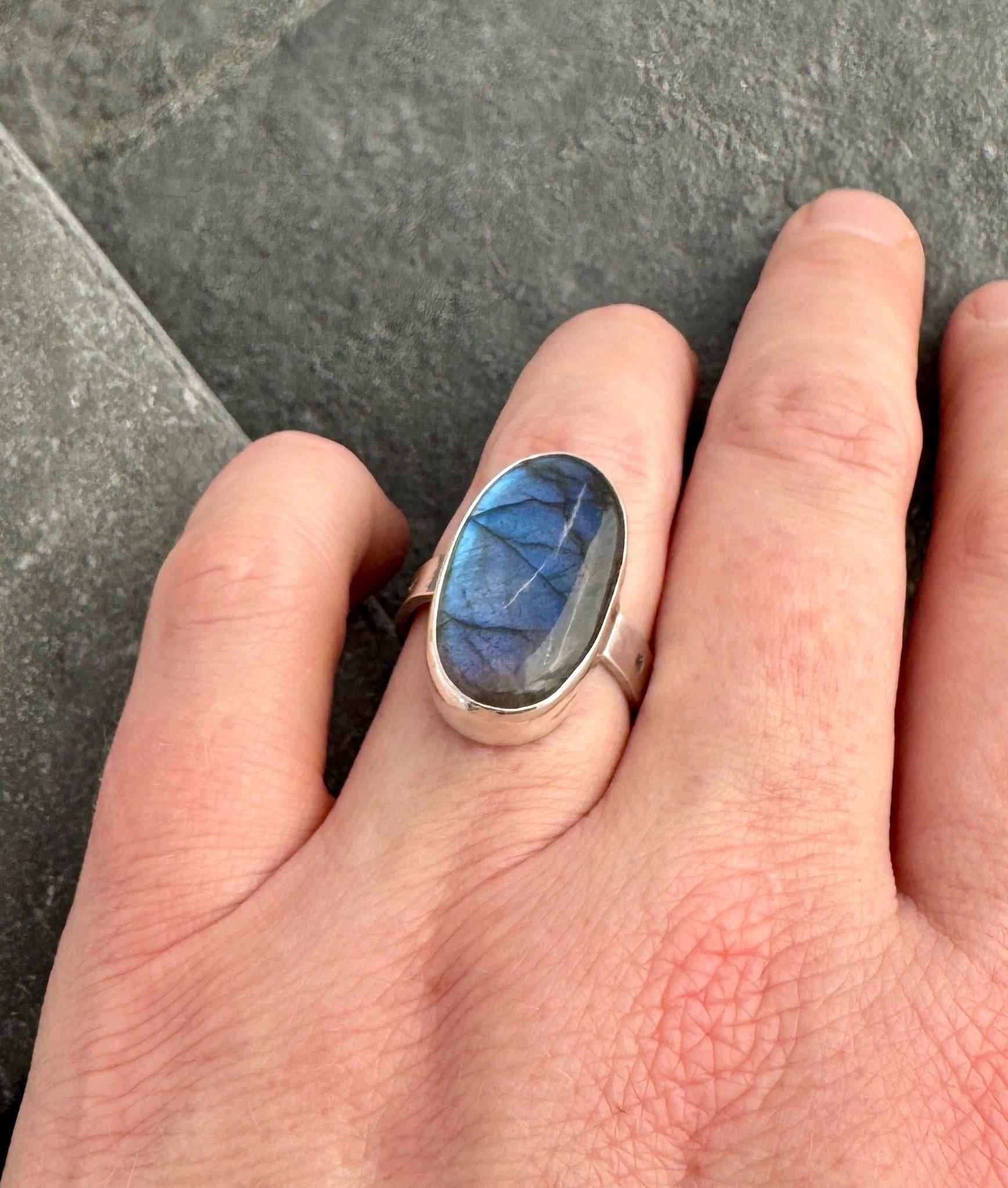 This large labradorite ring is full of beautiful blue flash. The stone is set in solid fine and sterling silver. The band is stamped with stars, complimenting the flashy deep blue color of the labradorite.