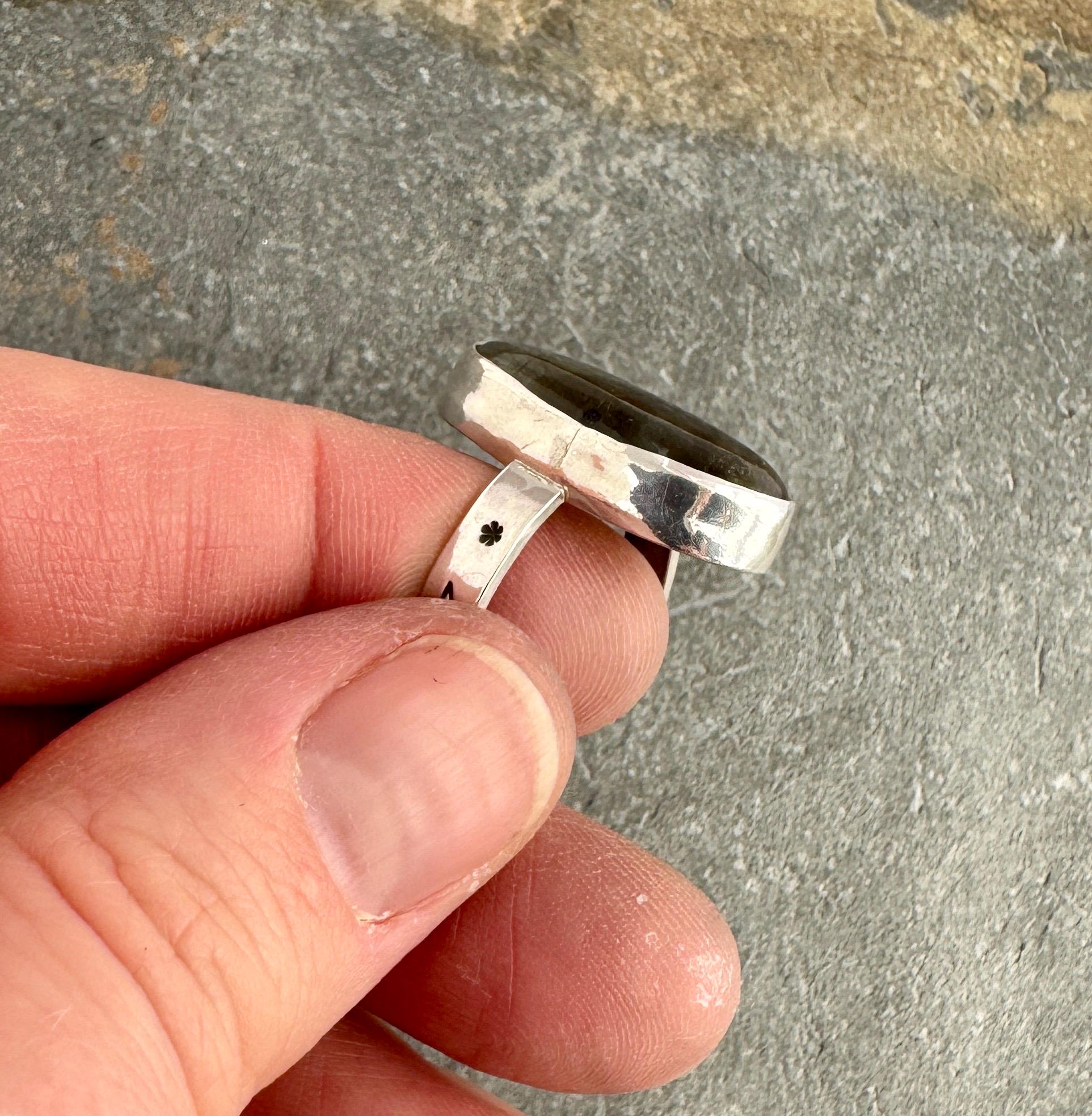 The stone measures 23mm x 13mm (7/8"x1/2"), and the ring is size 8.