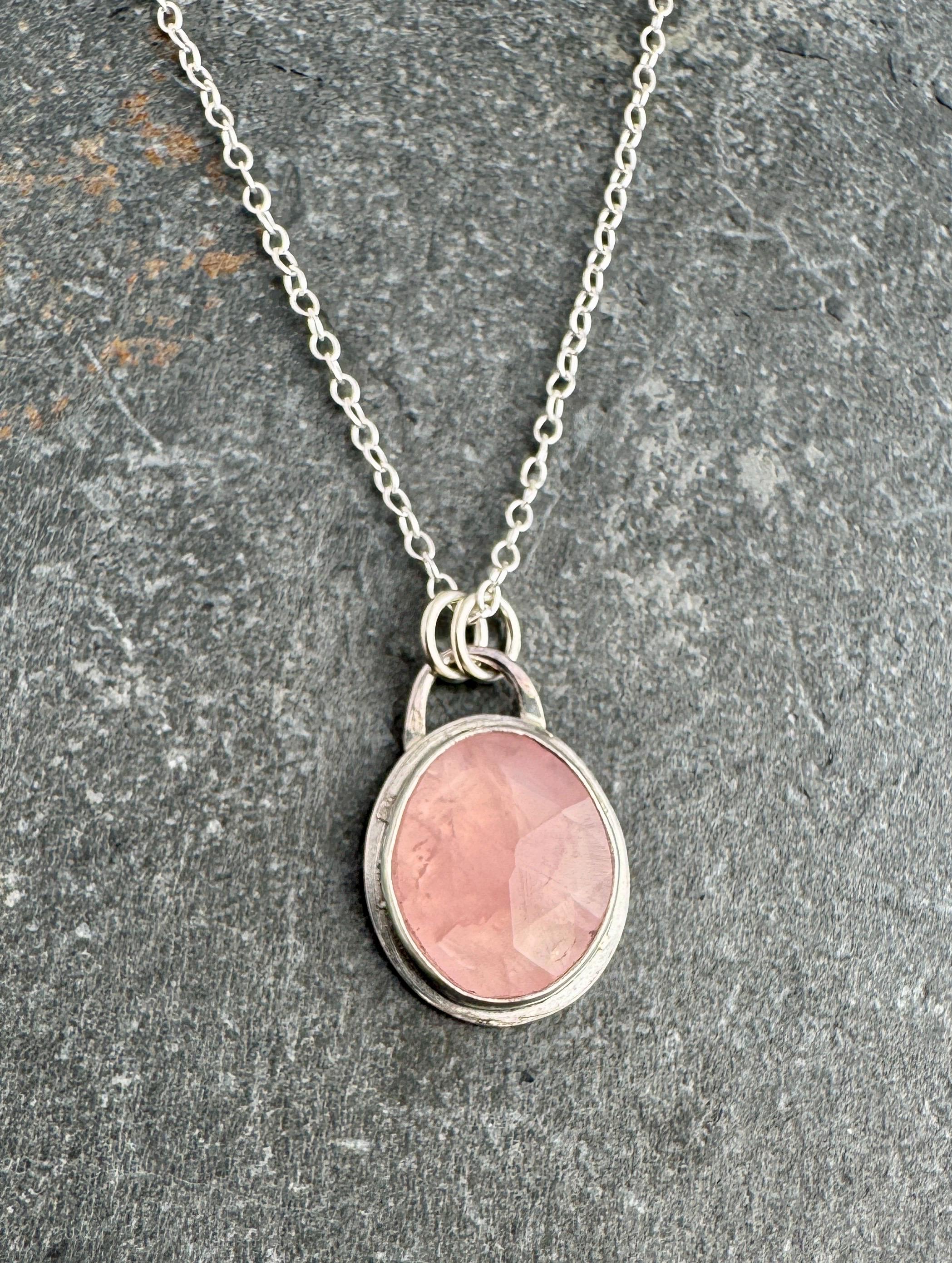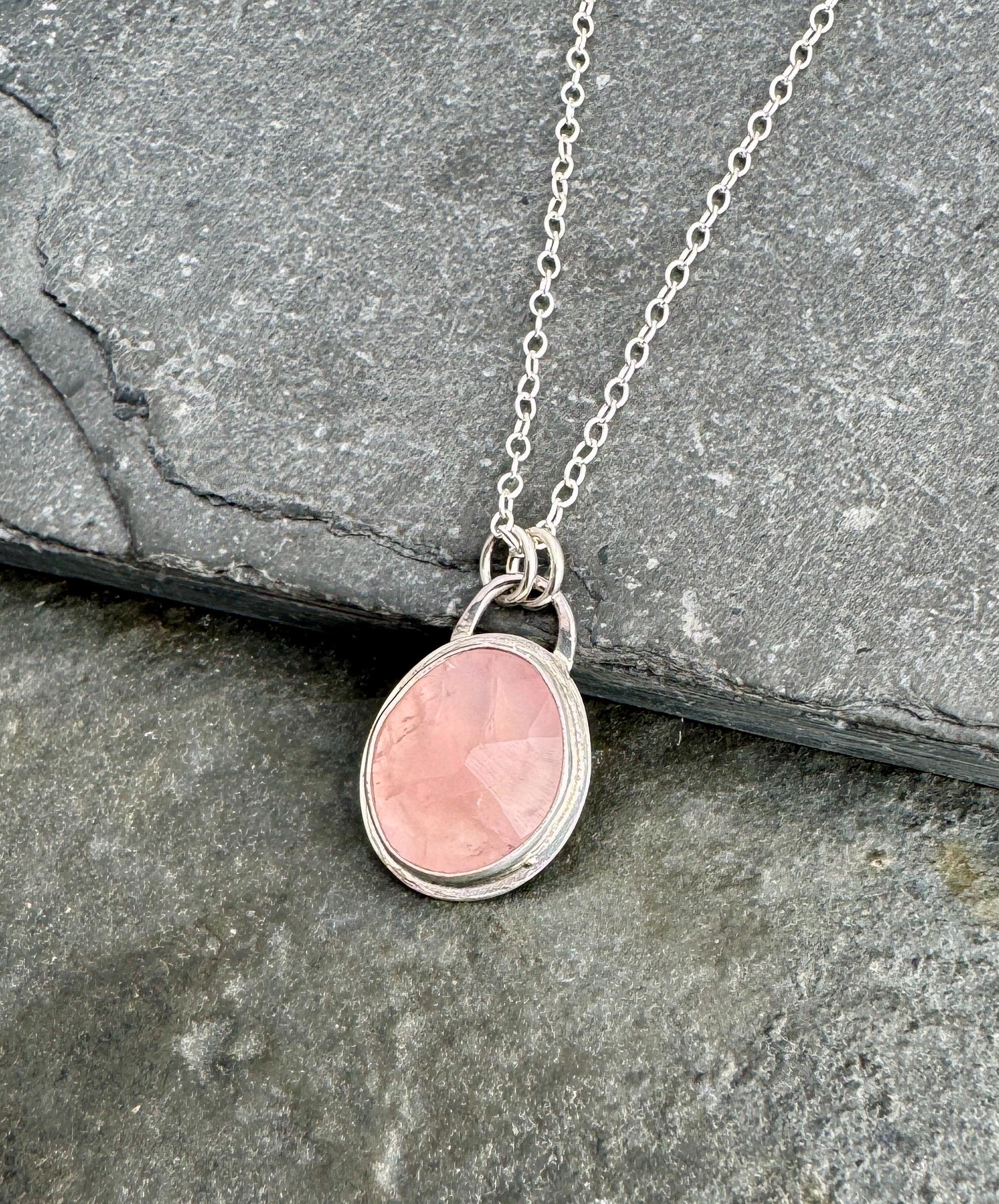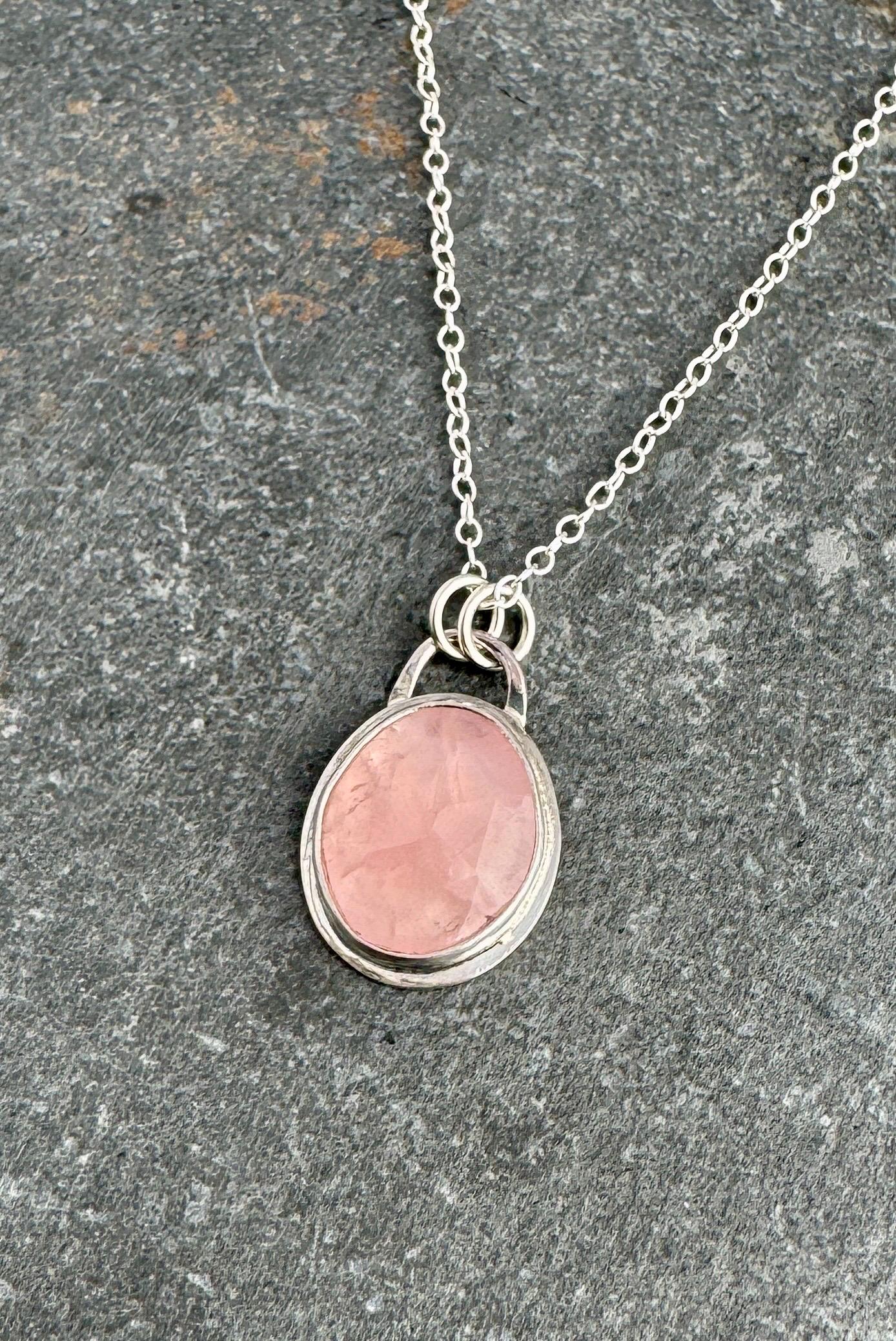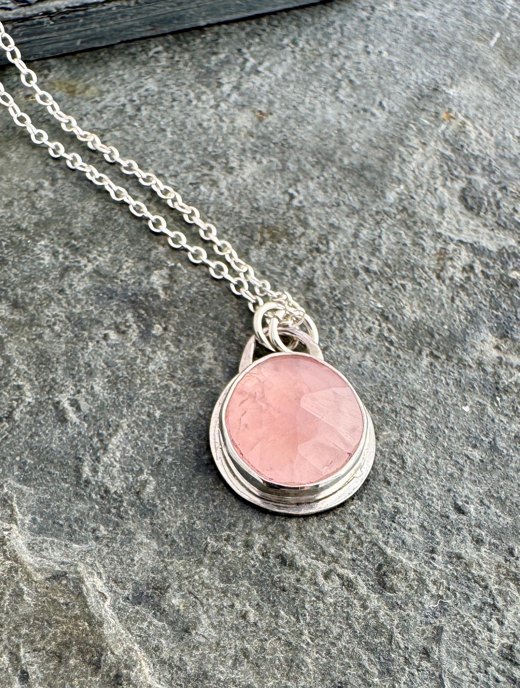 This simple necklace features a faceted rose quartz gemstone set in solid fine and sterling silver. The pendant hangs from a delicate sterling silver chain.