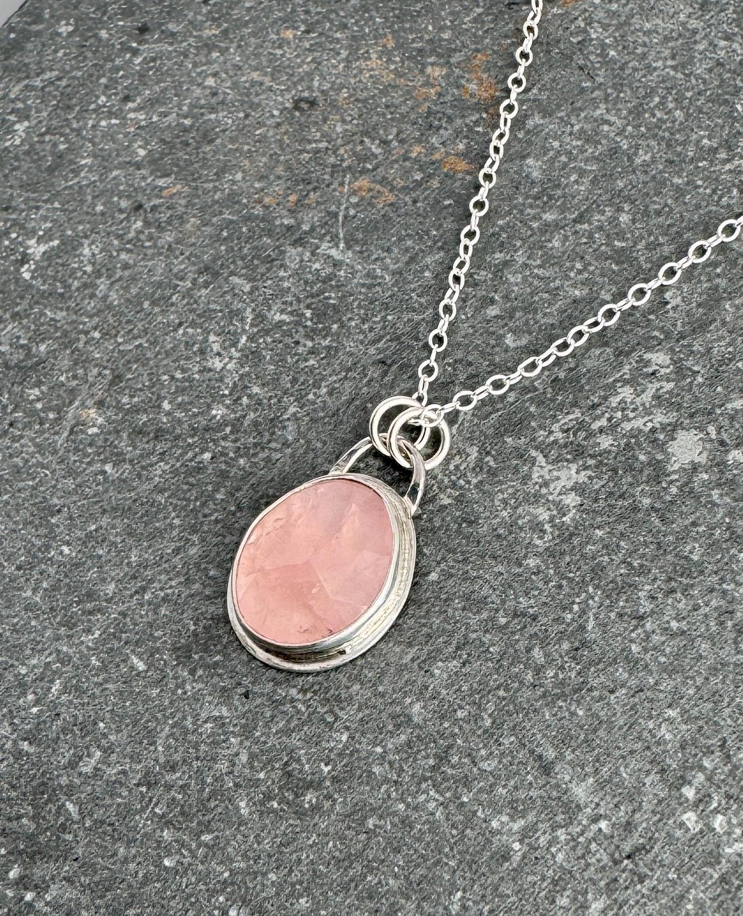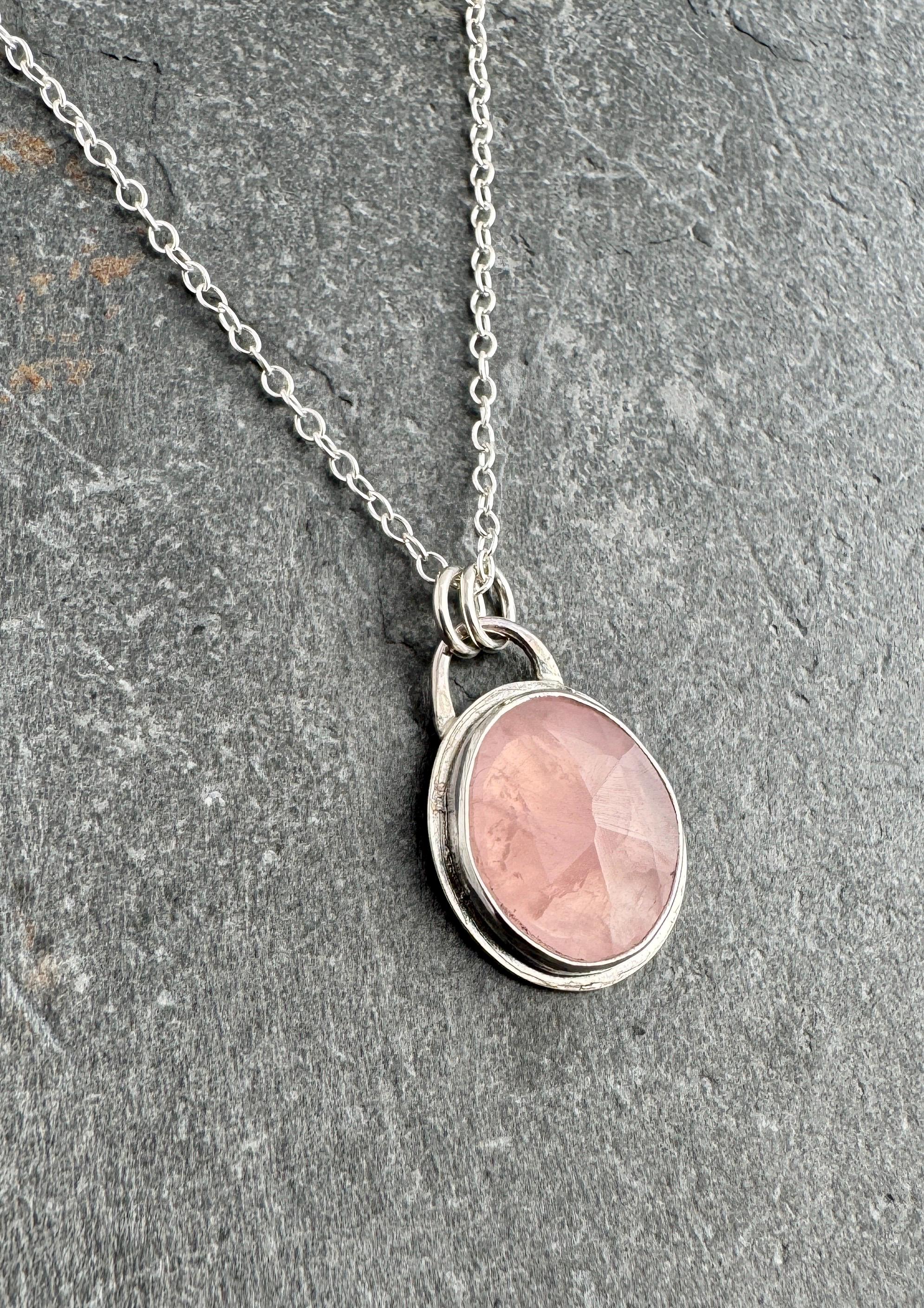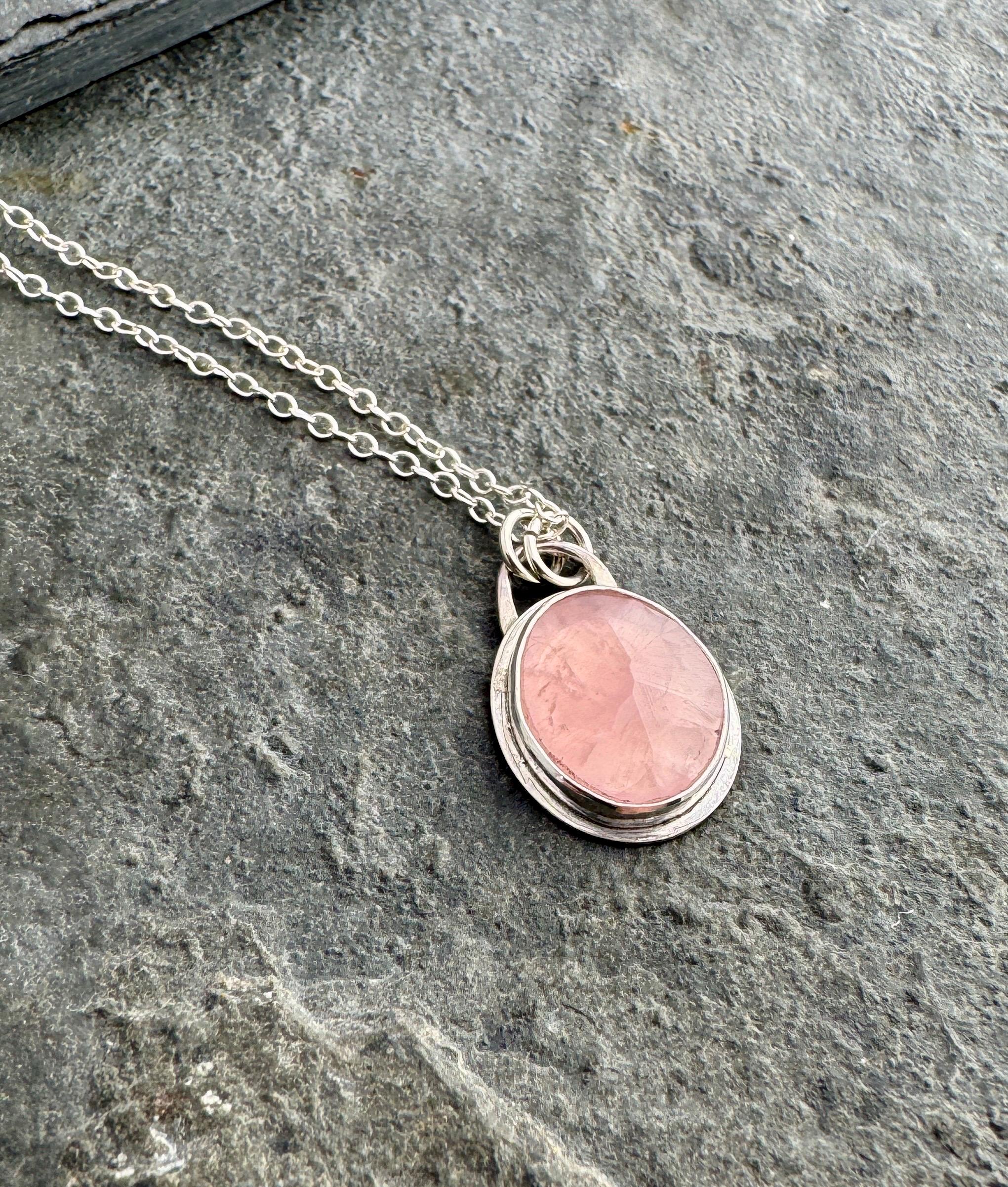 This simple necklace features a faceted rose quartz gemstone set in solid fine and sterling silver. The pendant hangs from a delicate sterling silver chain.