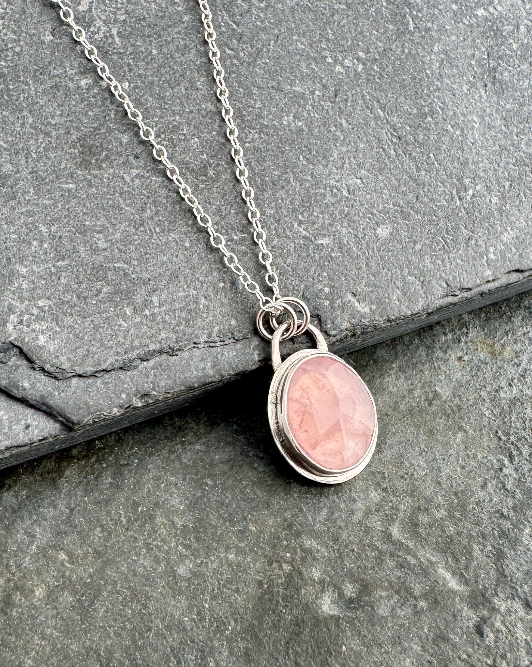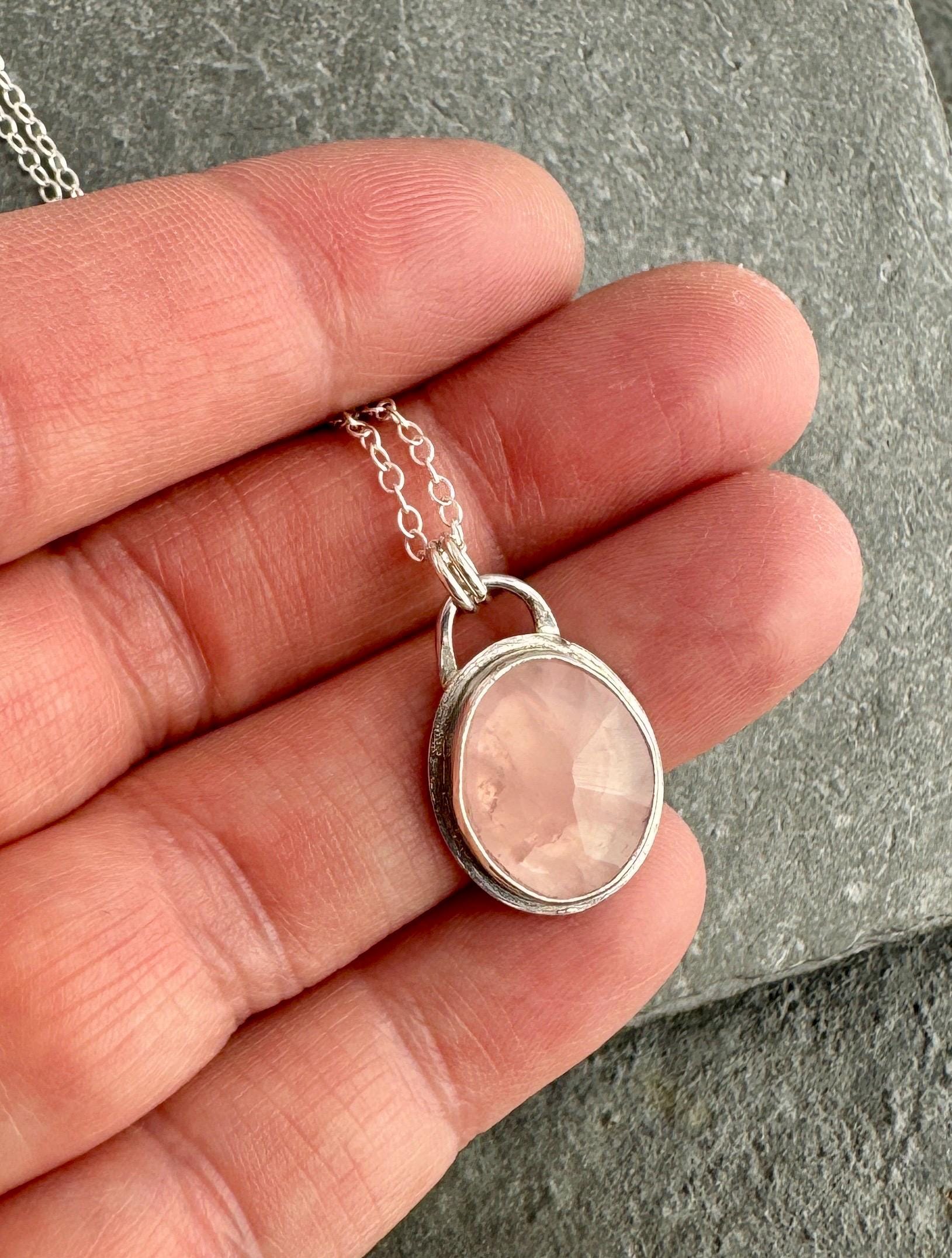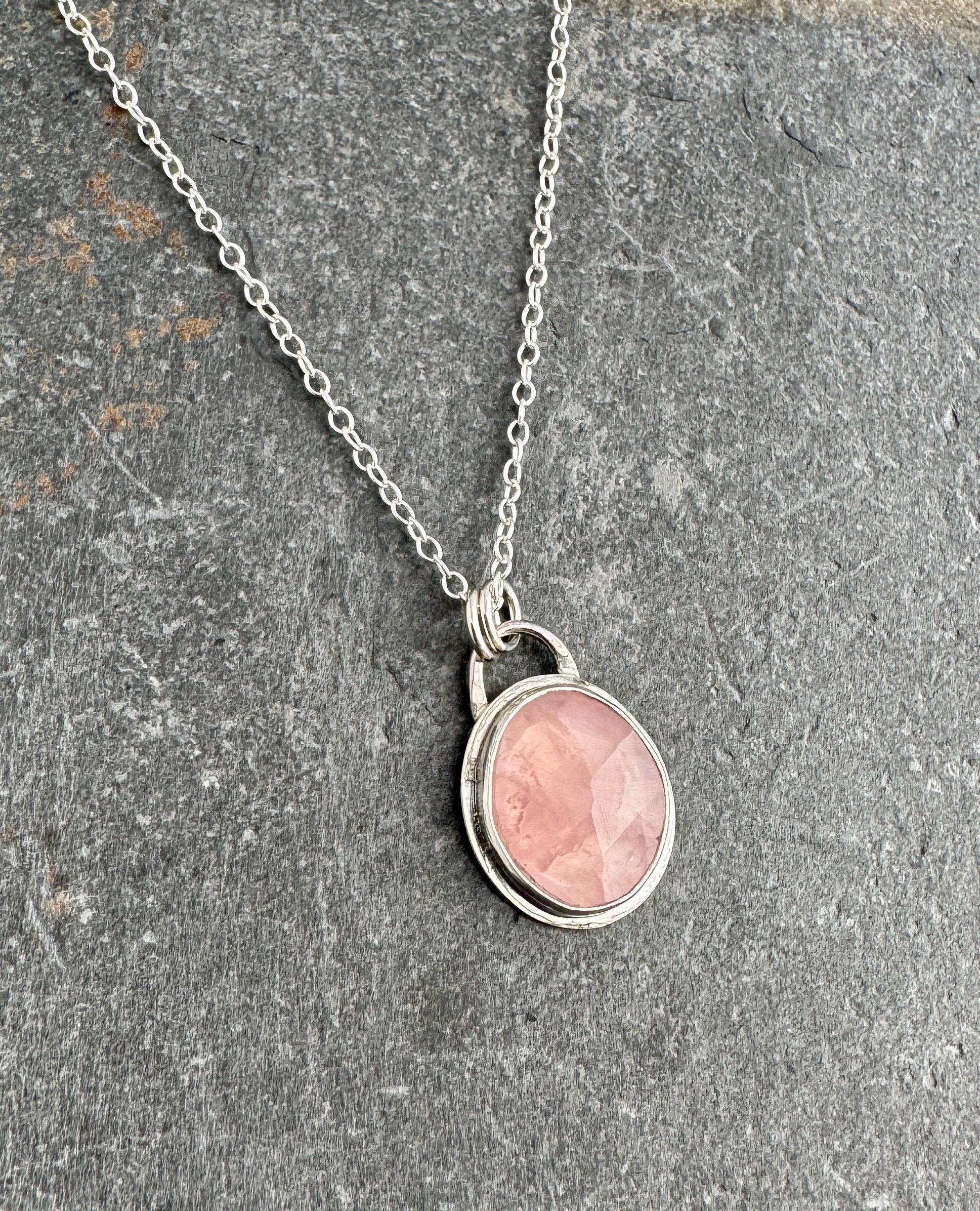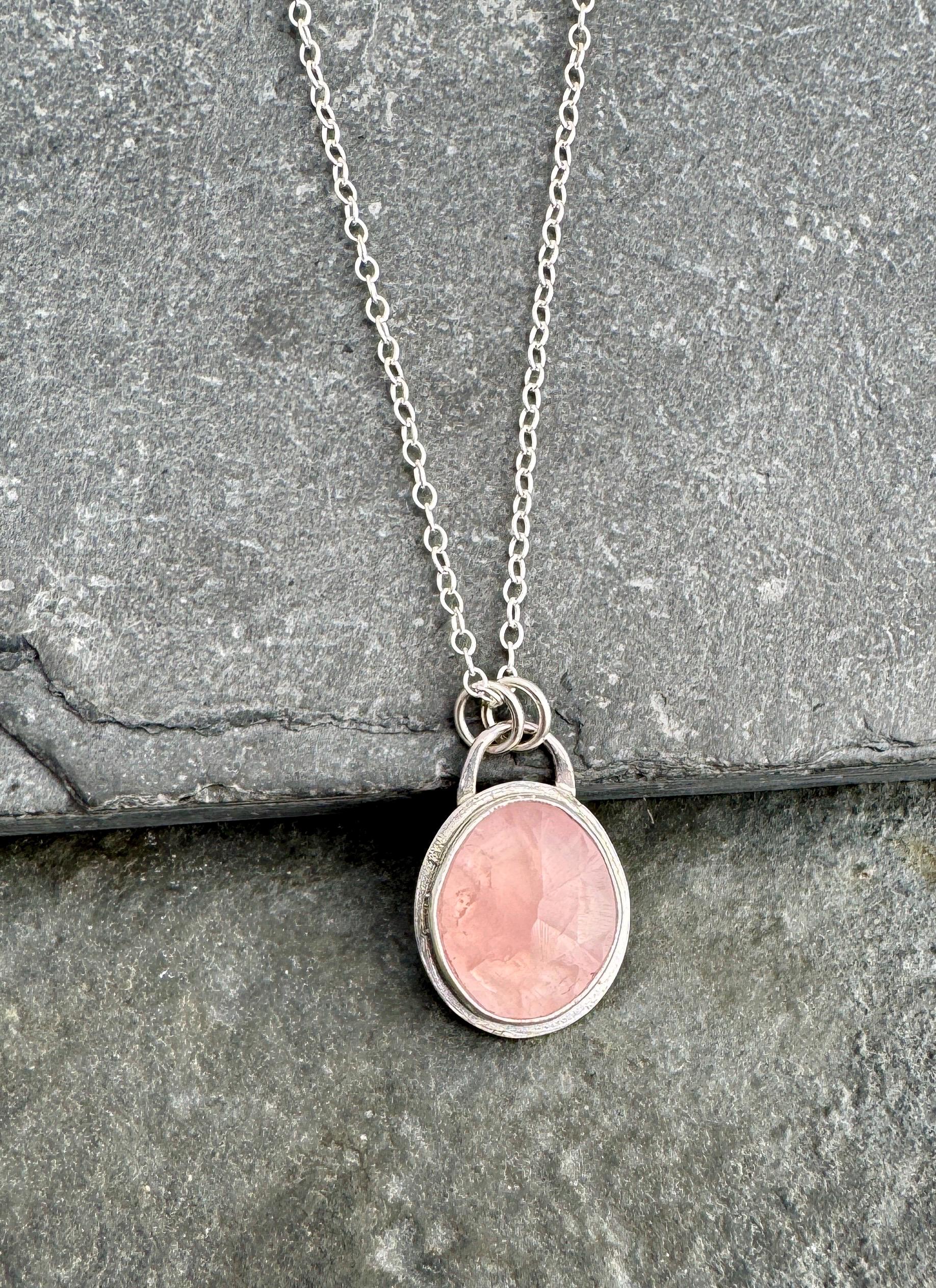 This simple necklace features a faceted rose quartz gemstone set in solid fine and sterling silver. The pendant hangs from a delicate sterling silver chain.