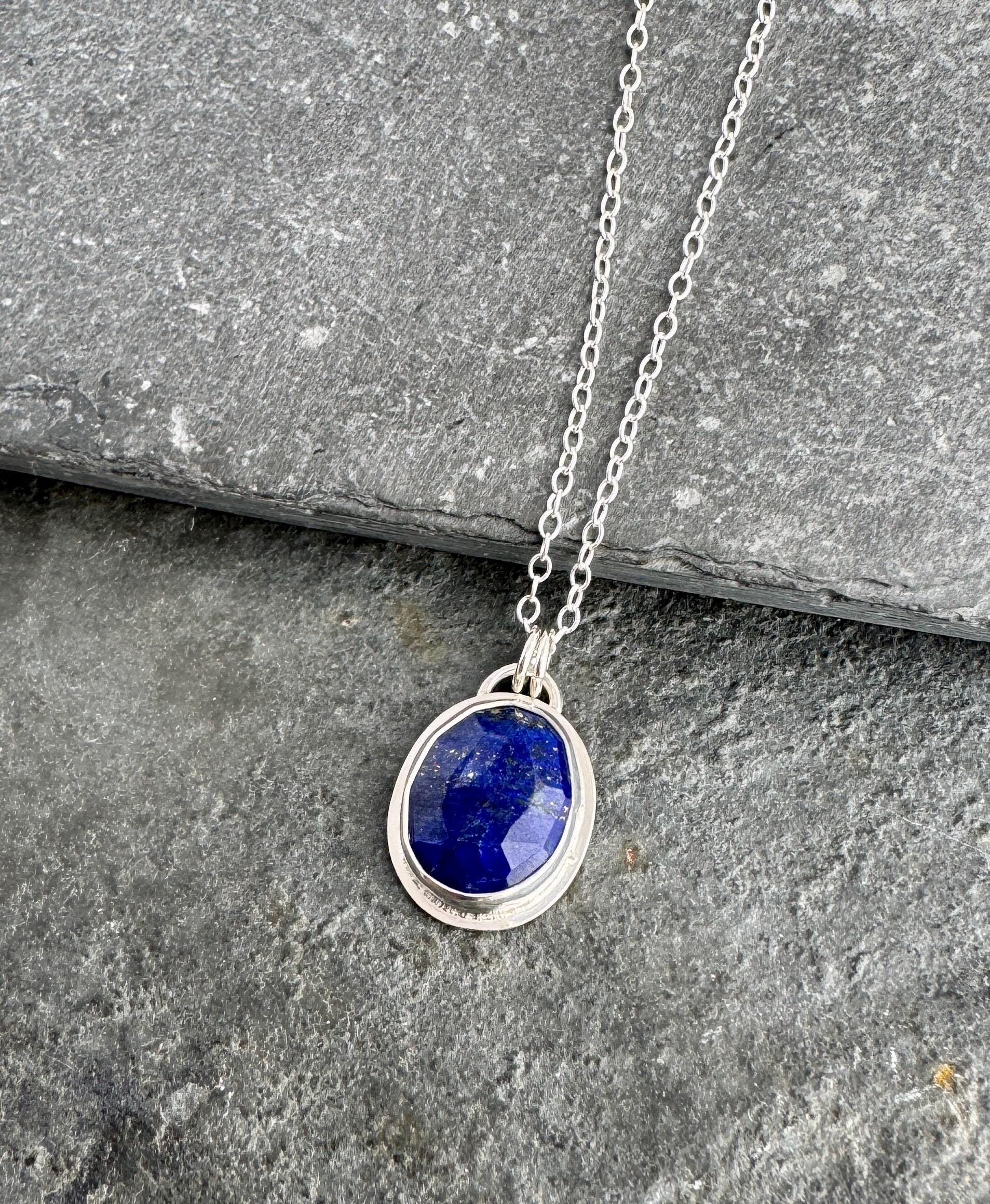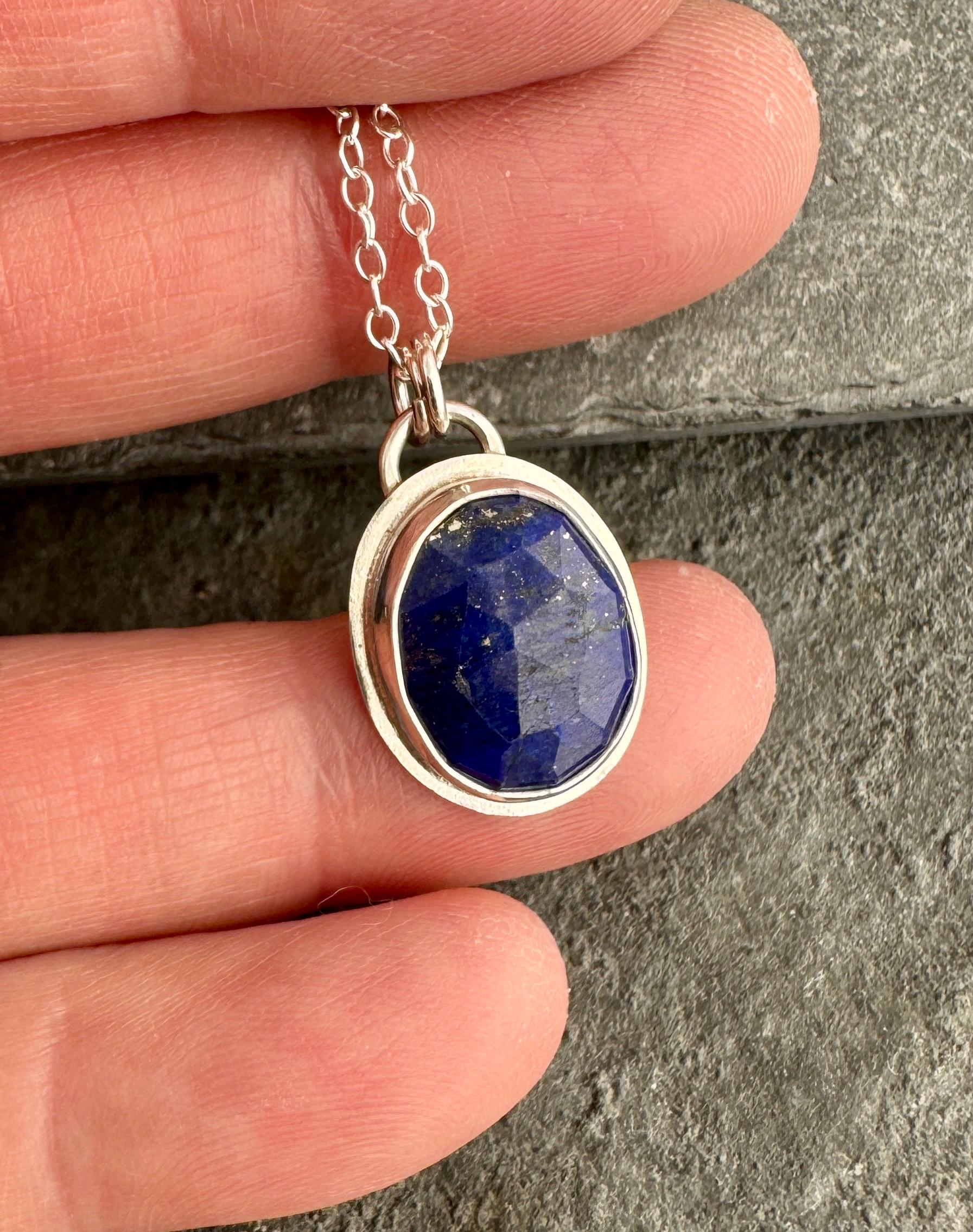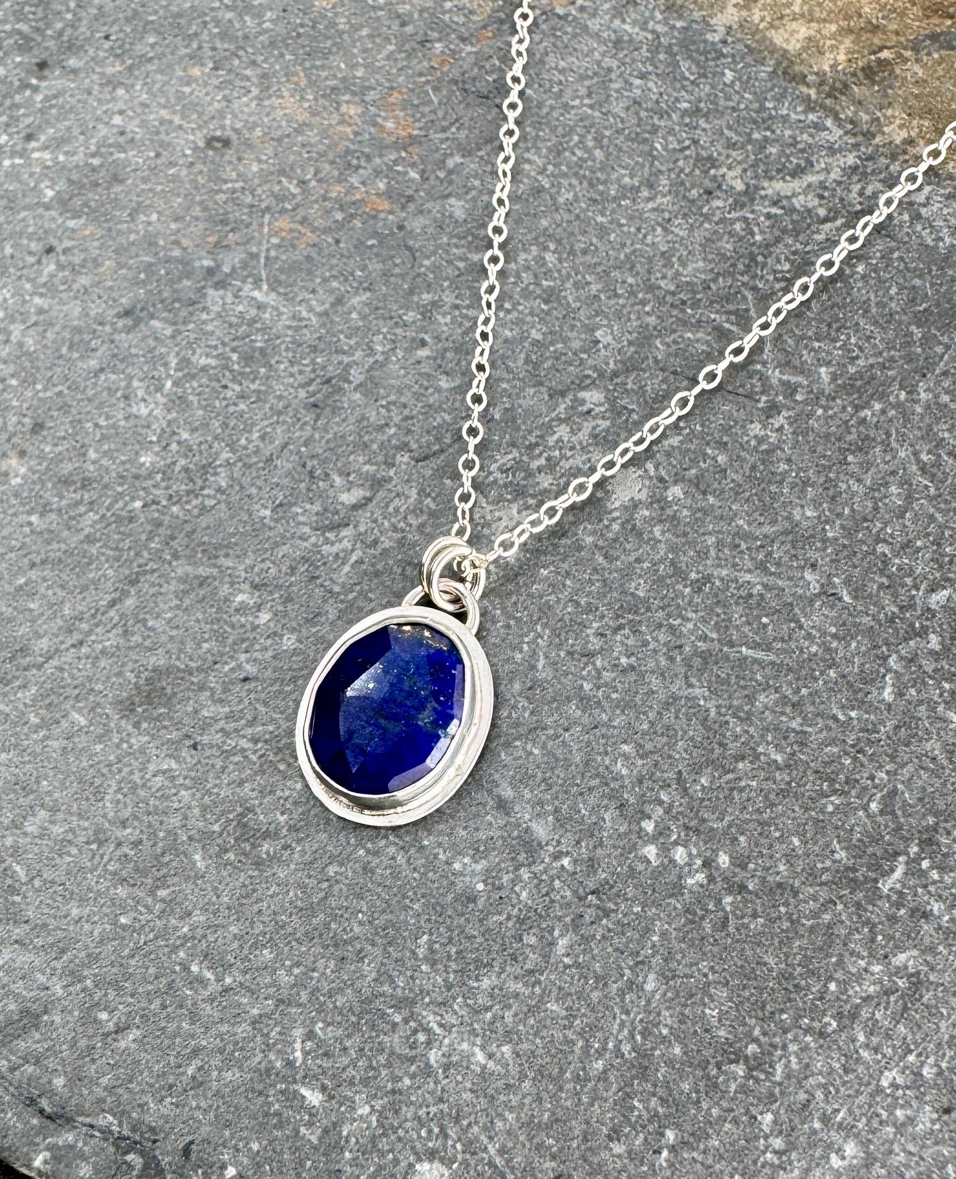 The small gemstone pendant necklace features a deep blue faceted lapis lazuli gemstone. The stone is set in solid fine and sterling silver, and hangs from a delicate sterling silver chain.
