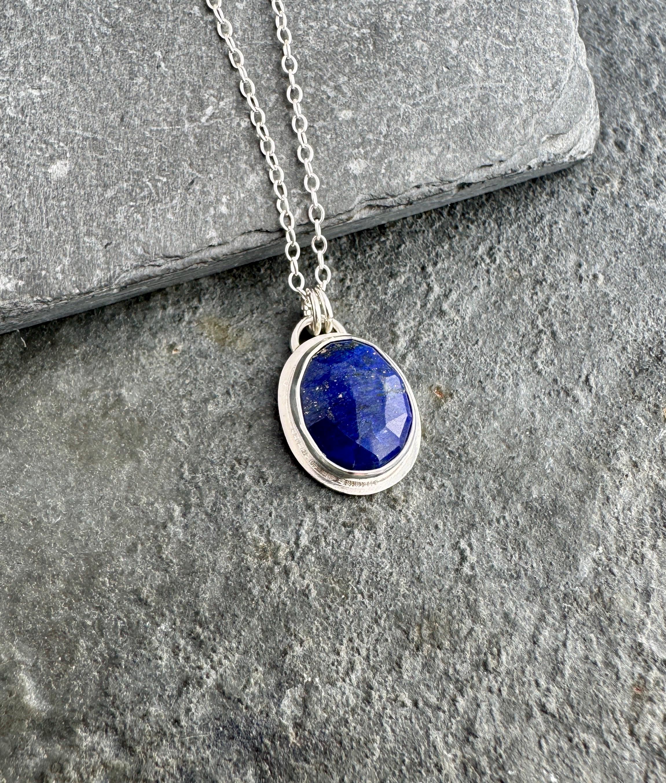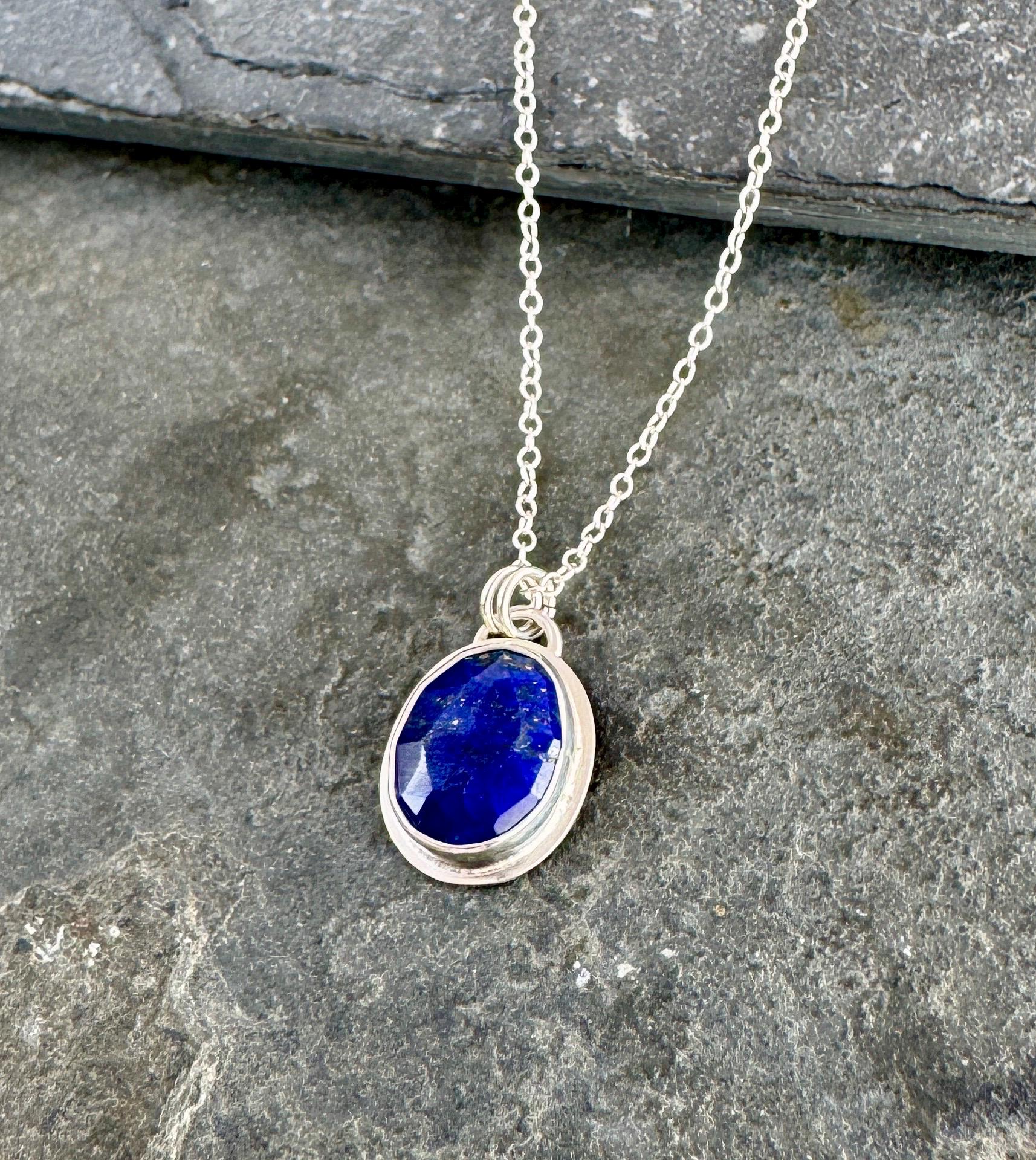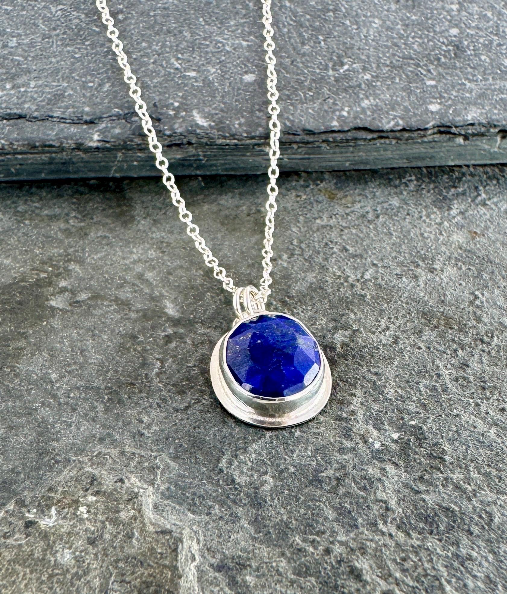 The small gemstone pendant necklace features a deep blue faceted lapis lazuli gemstone. The stone is set in solid fine and sterling silver, and hangs from a delicate sterling silver chain.