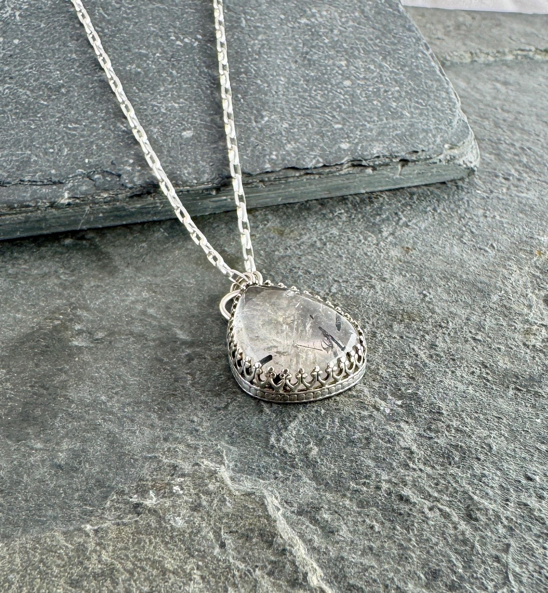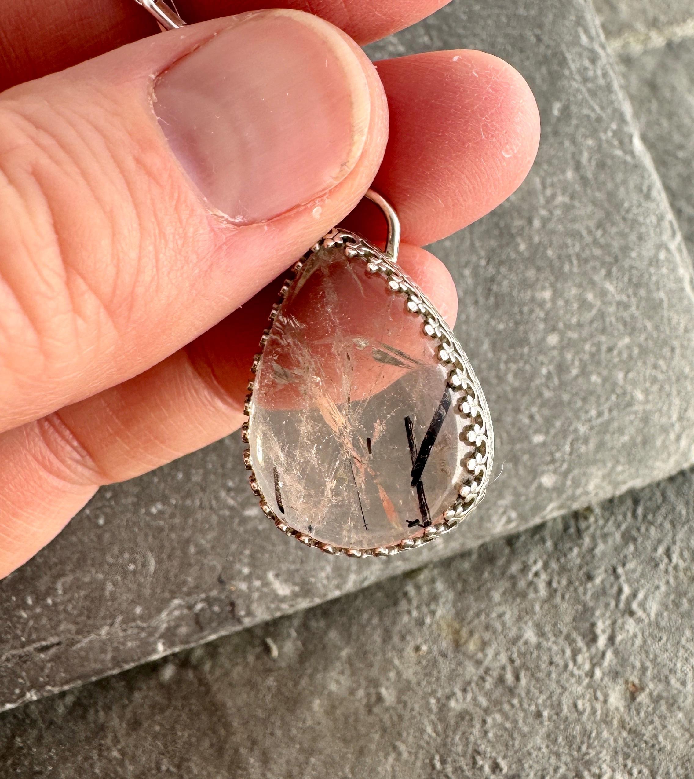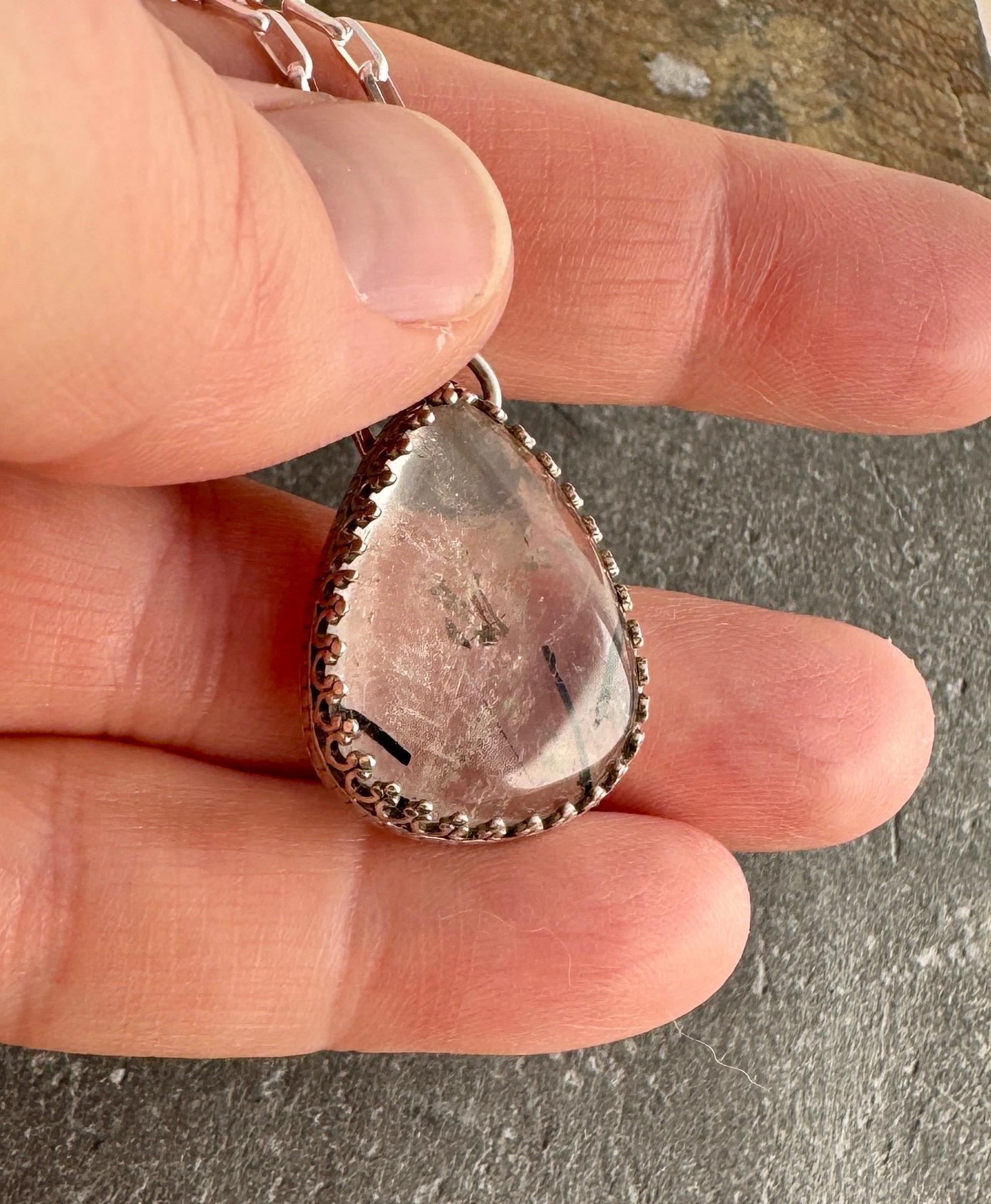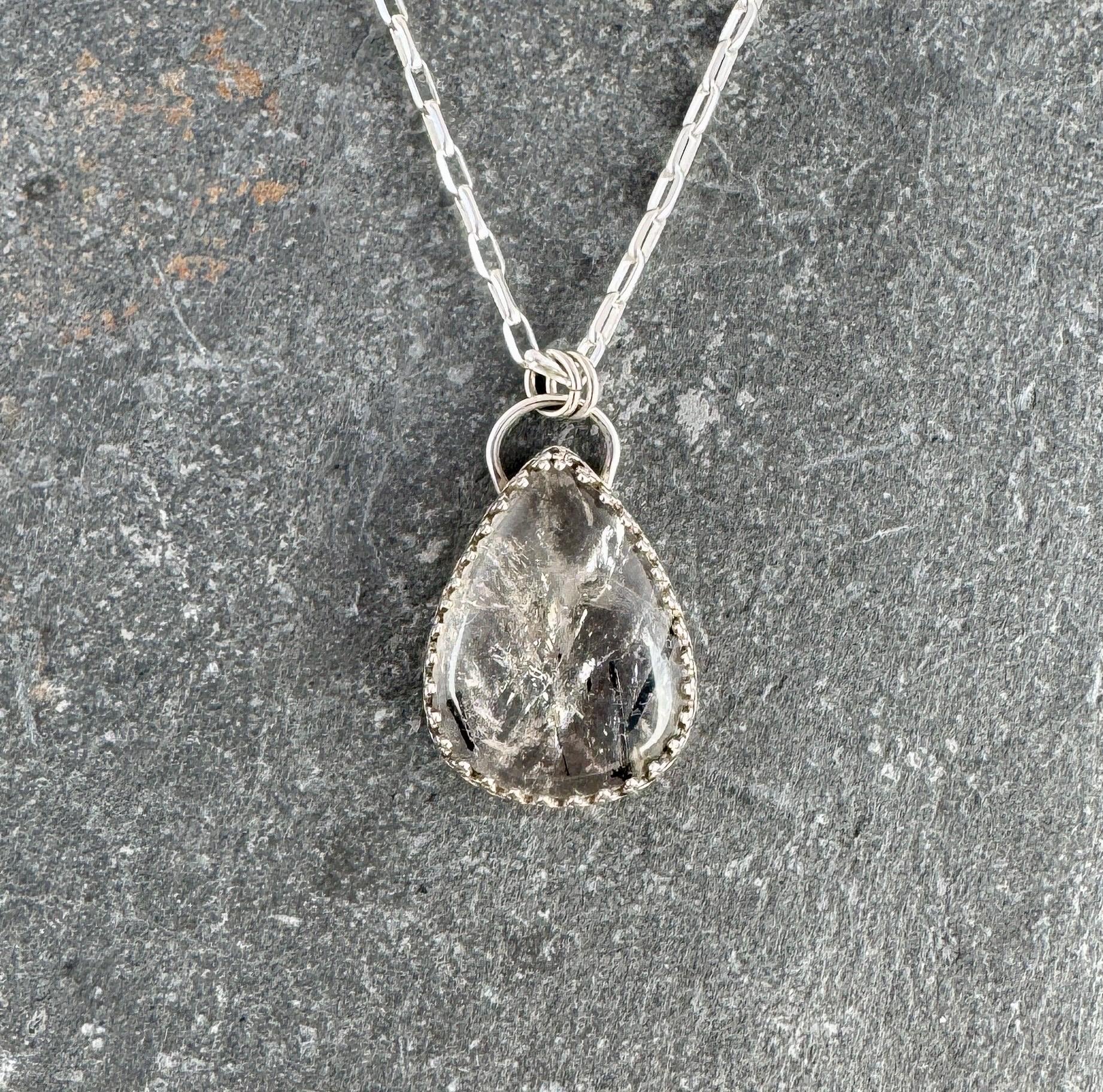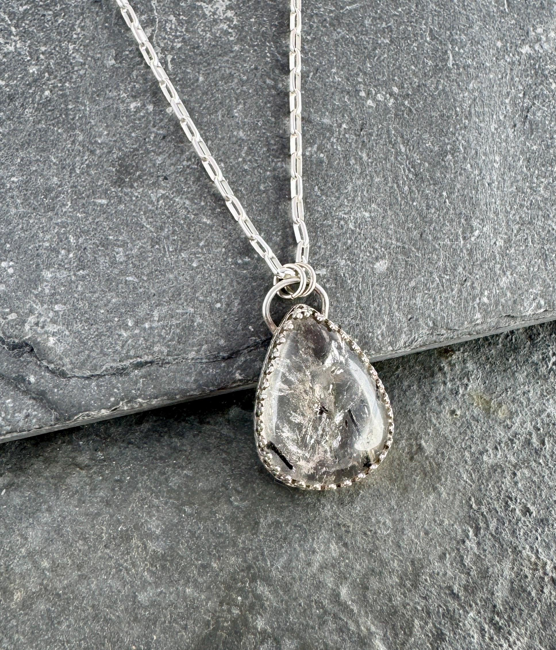 This clear quartz gemstone necklace includes striking tourmaline inclusions. The teardrop gemstone is set in a gallery bezel setting with an open back. The pendant hangs from a small box paperclip chain.