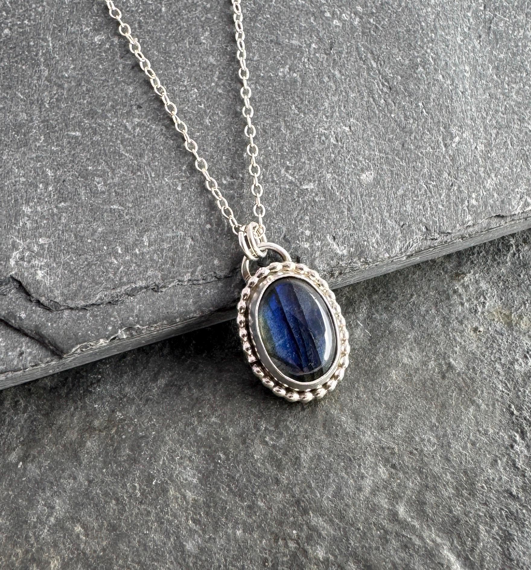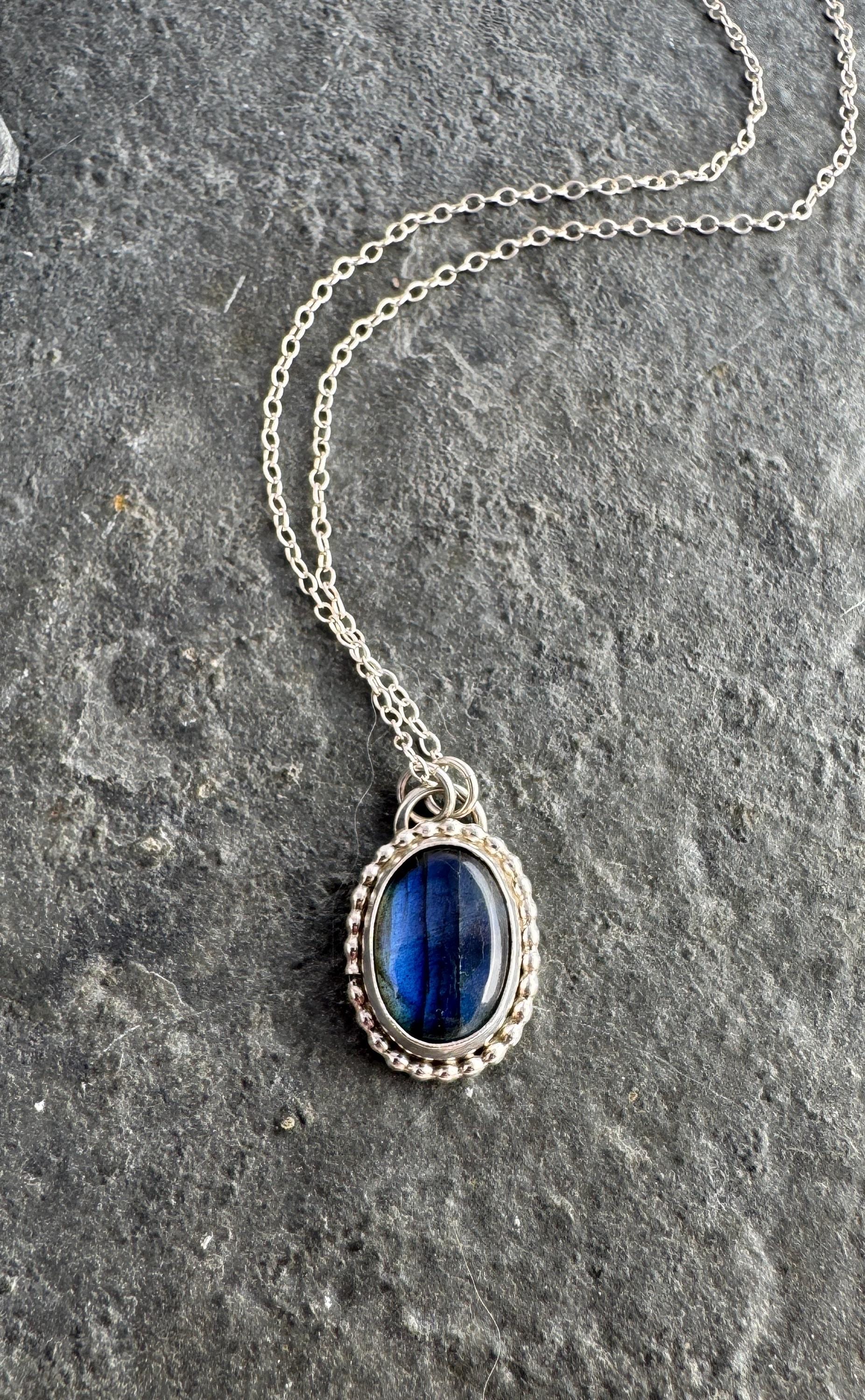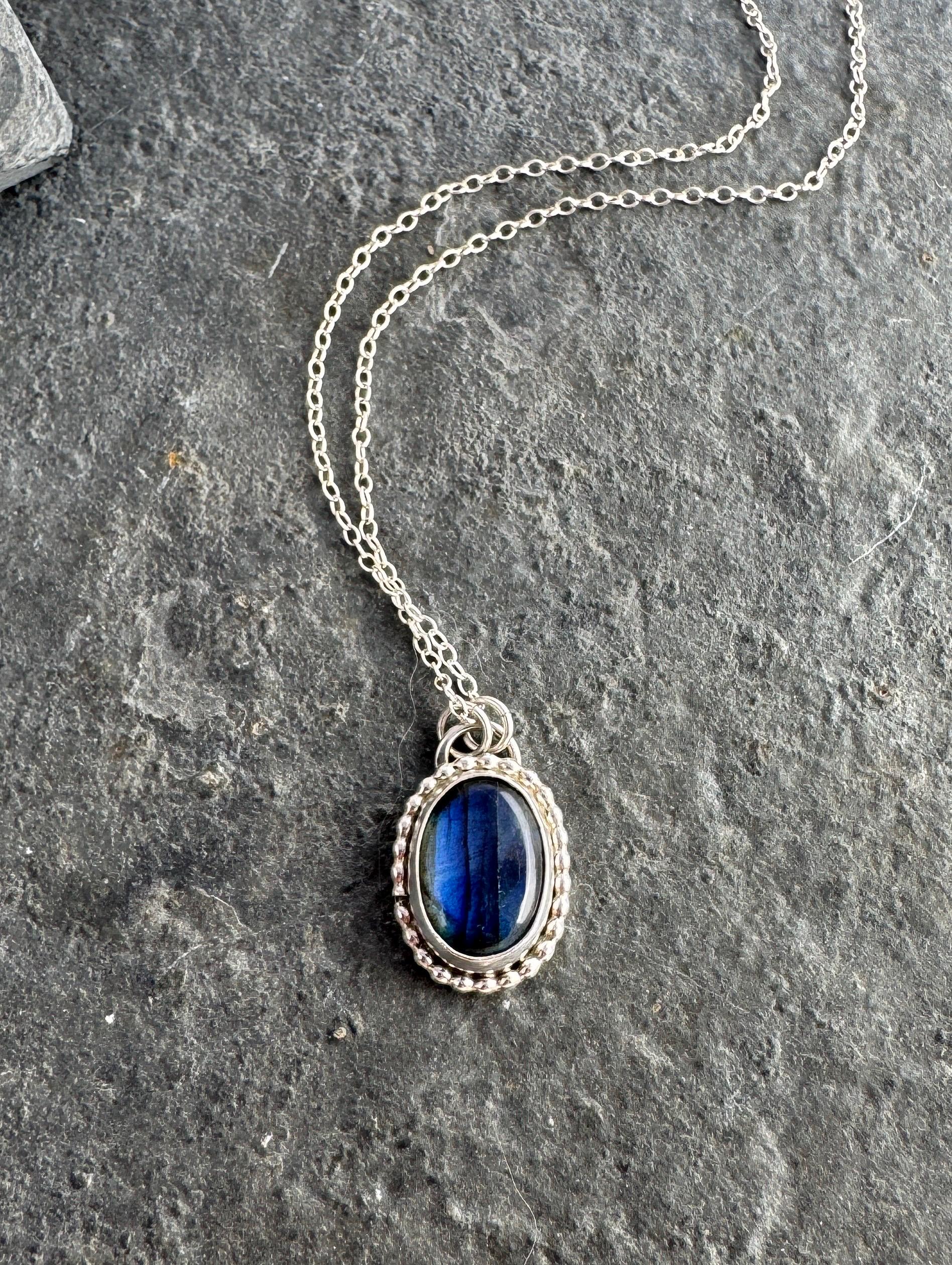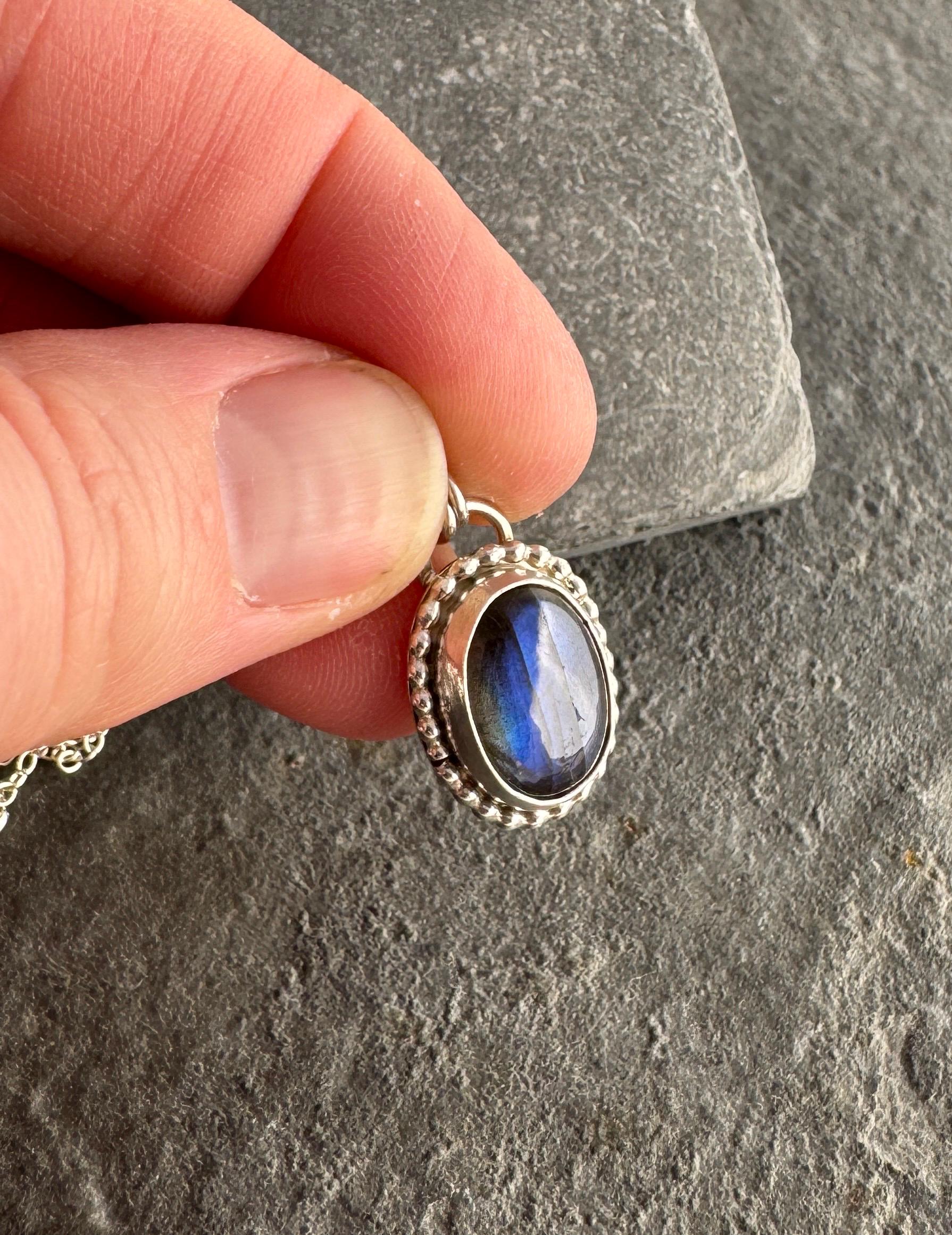 This Labradorite gemstone is filled with deep blue flash. The small oval gemstone is surrounded by beaded sterling silver, and the pendant hangs from a delicate solid sterling silver chain. Please select your desired chain length.