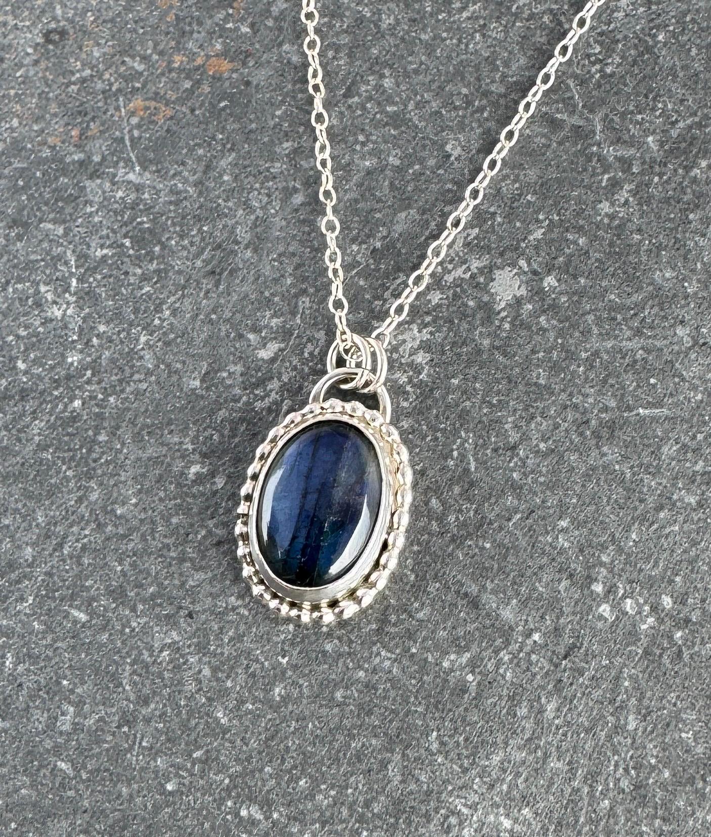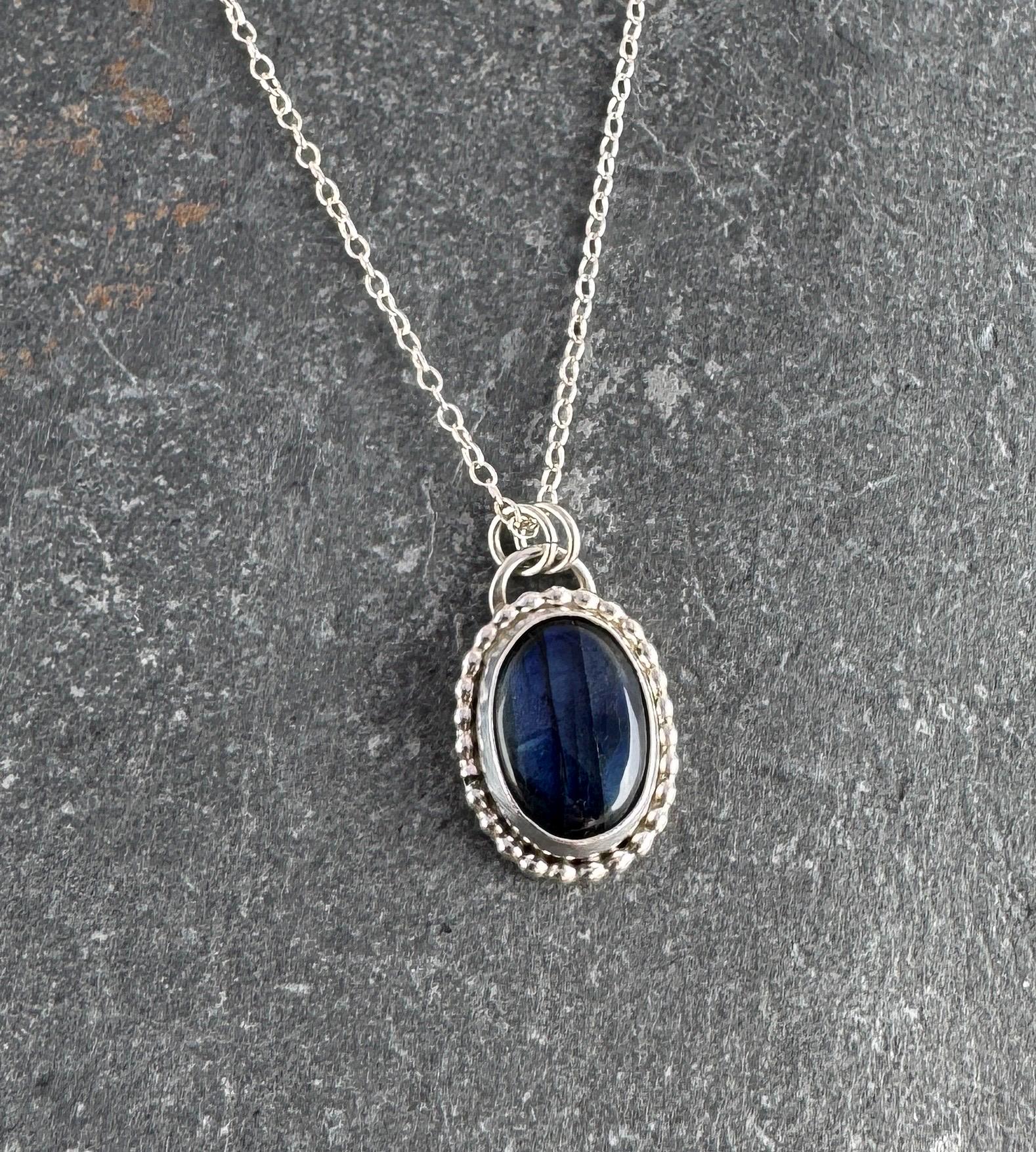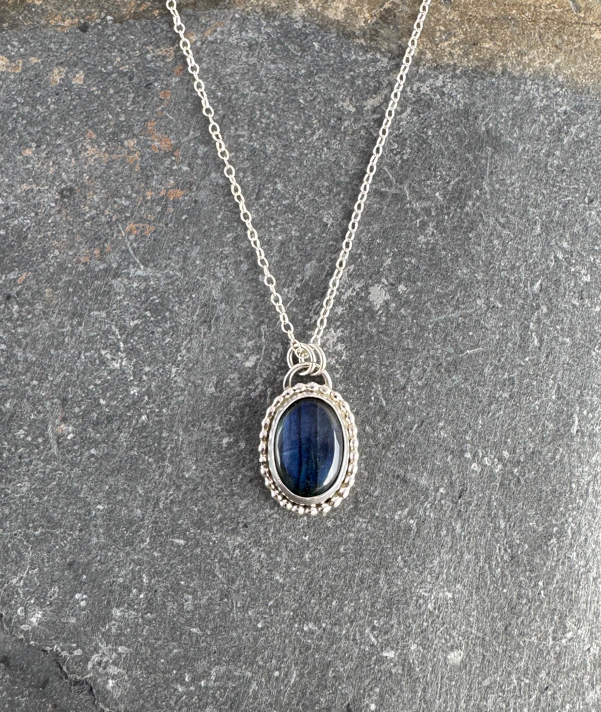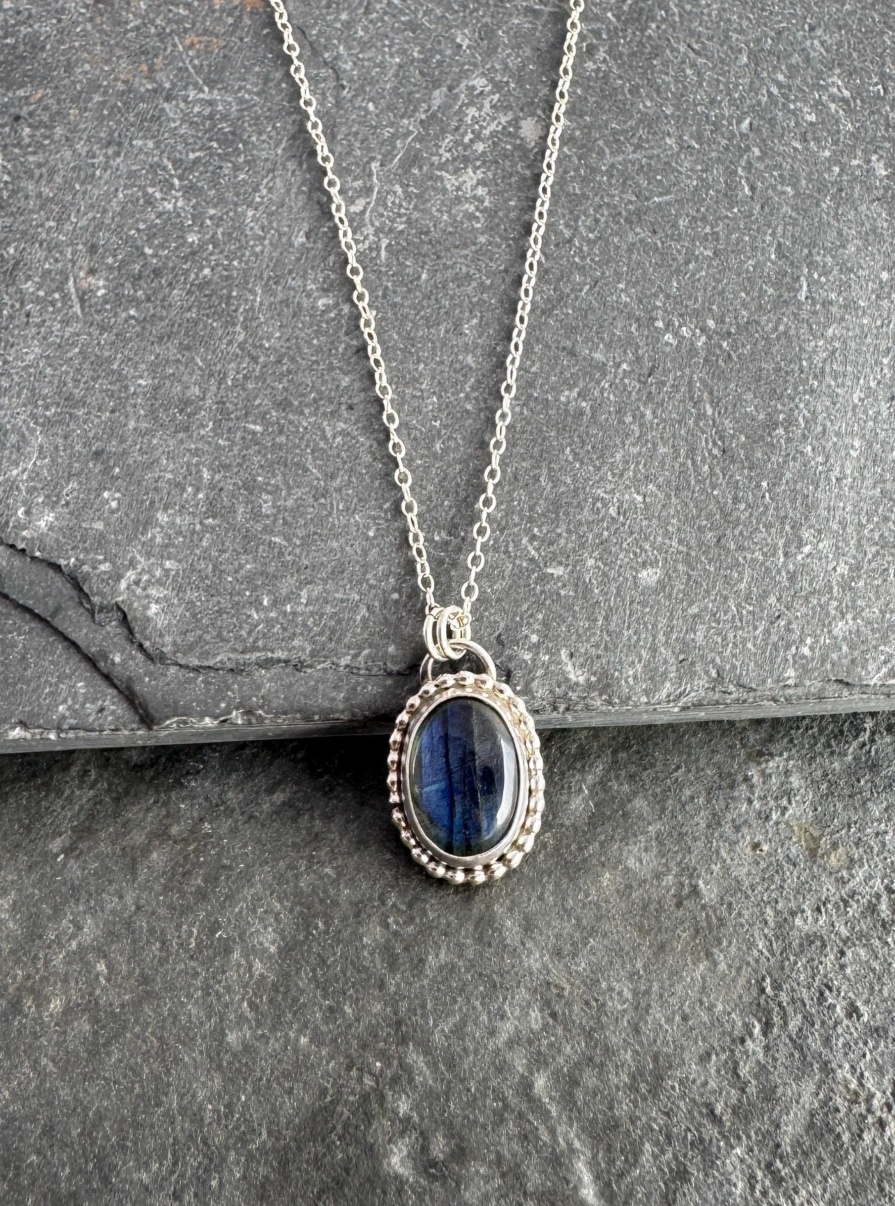 This Labradorite gemstone is filled with deep blue flash. The small oval gemstone is surrounded by beaded sterling silver, and the pendant hangs from a delicate solid sterling silver chain. Please select your desired chain length.