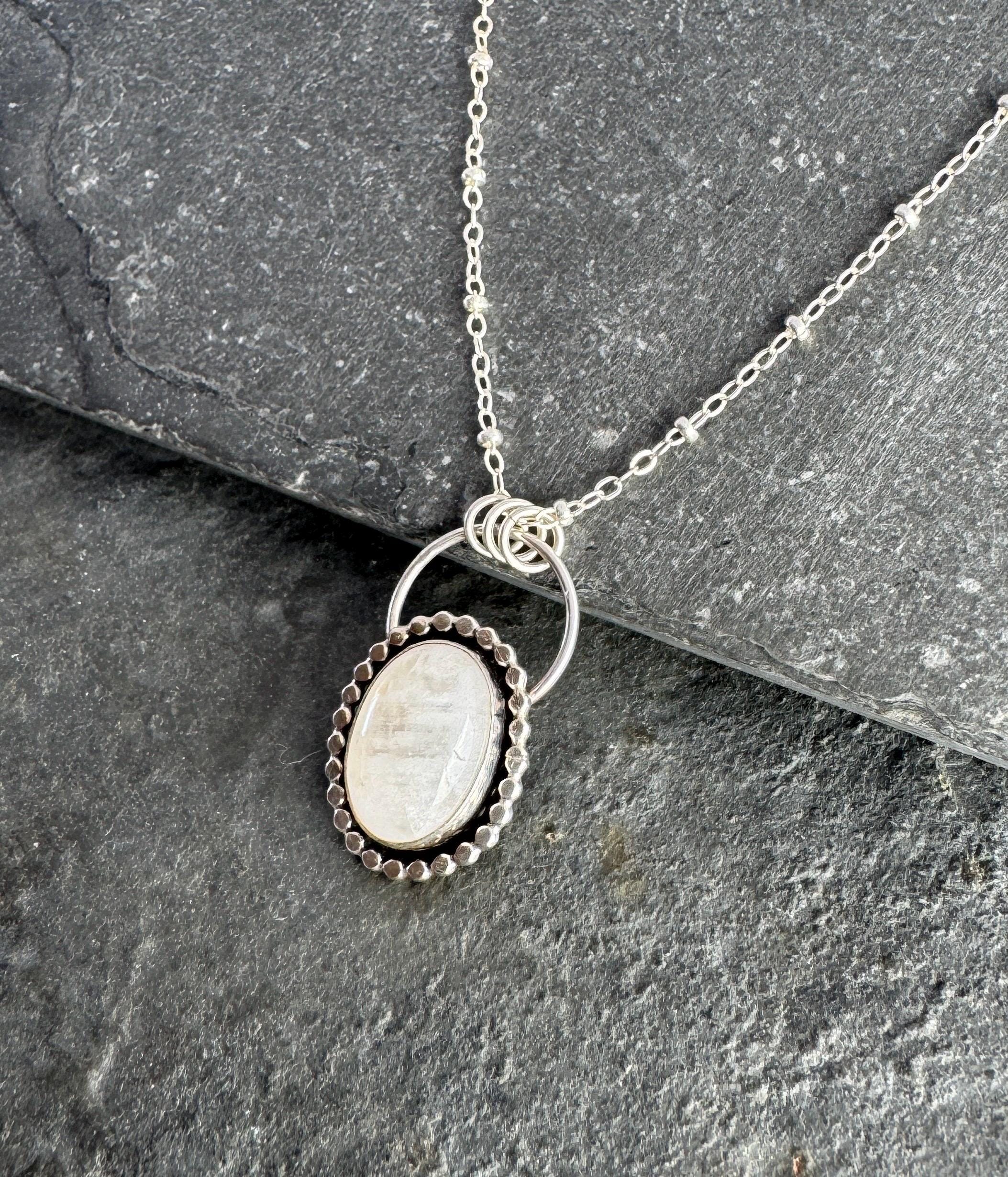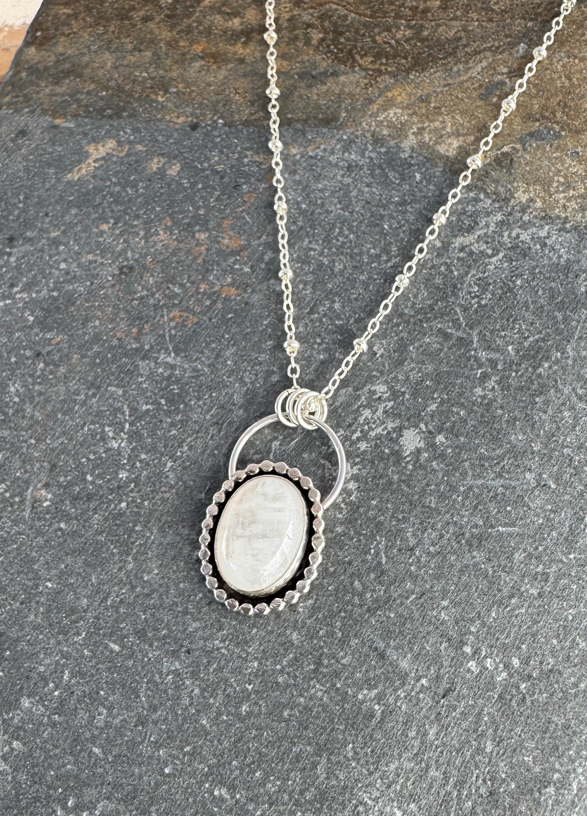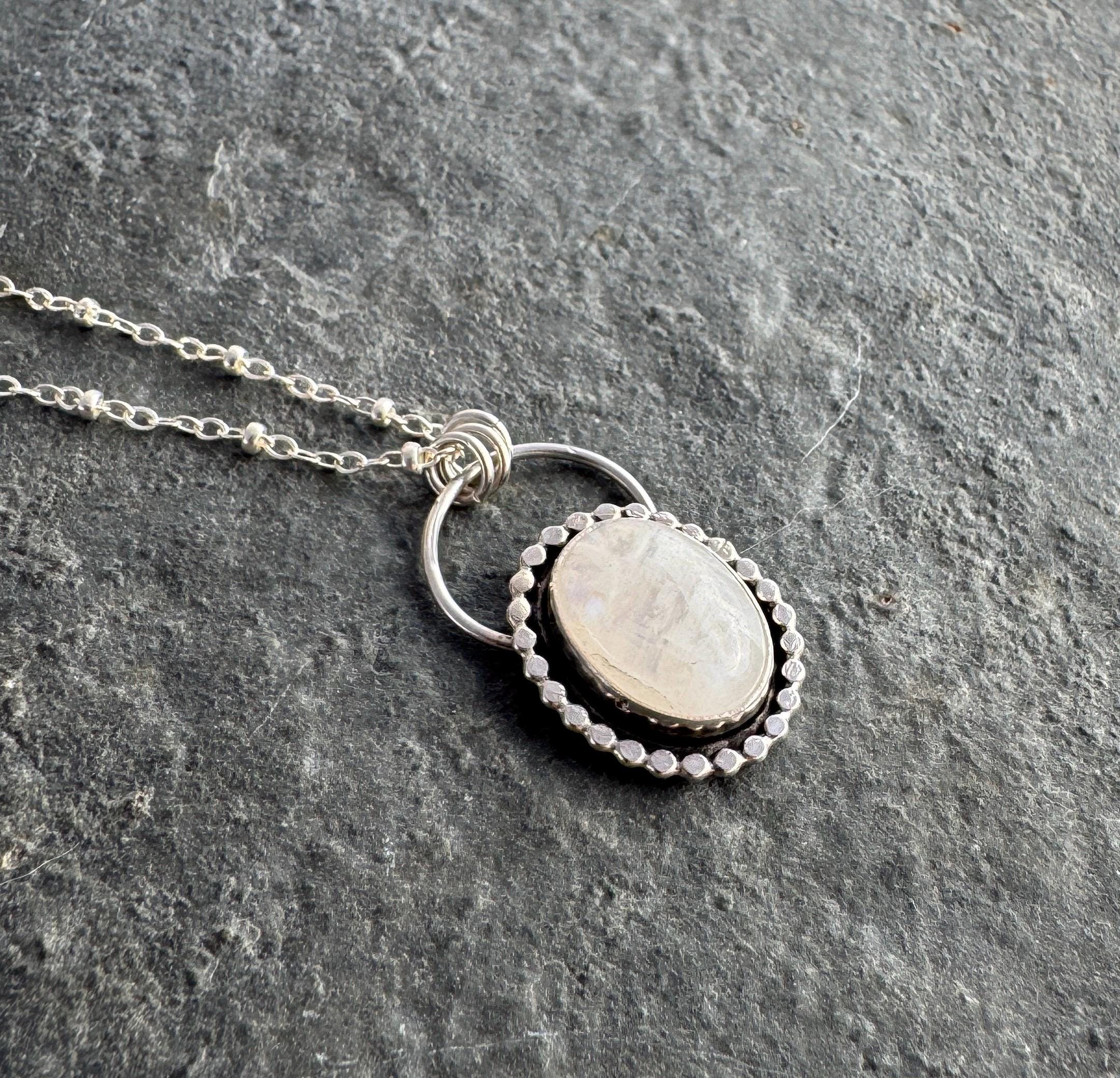 This rainbow moonstone necklace features a glowing flashy rainbow moonstone, surrounded by sterling silver and hanging from a saturn sterling silver chain. The rainbow moonstone gemstone is neutral but not at all boring.