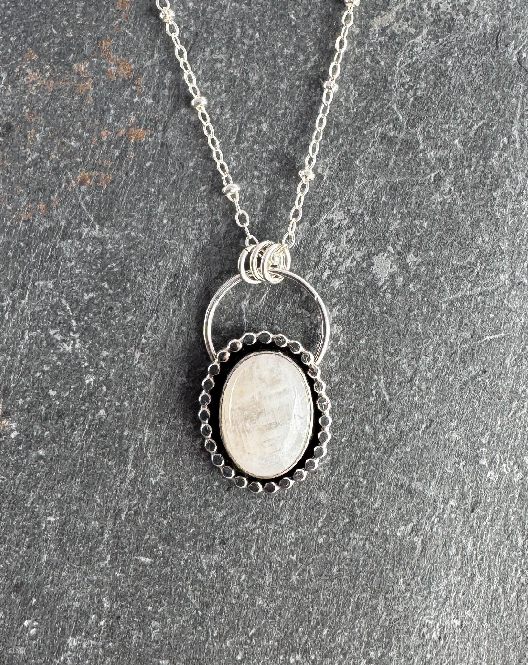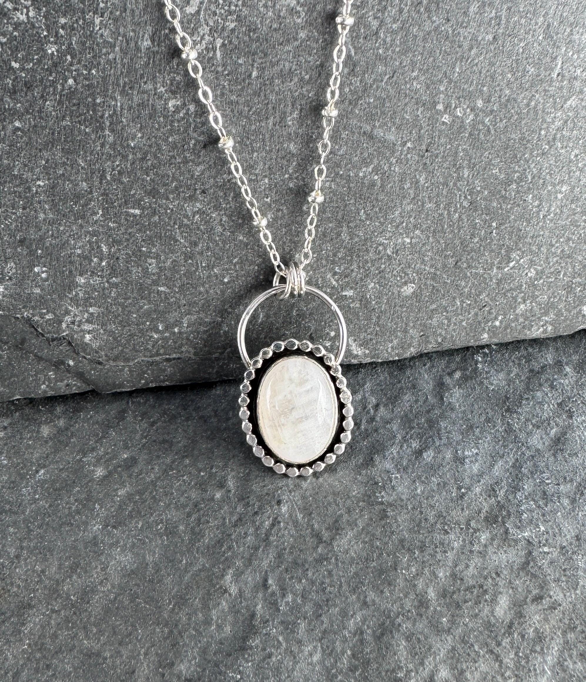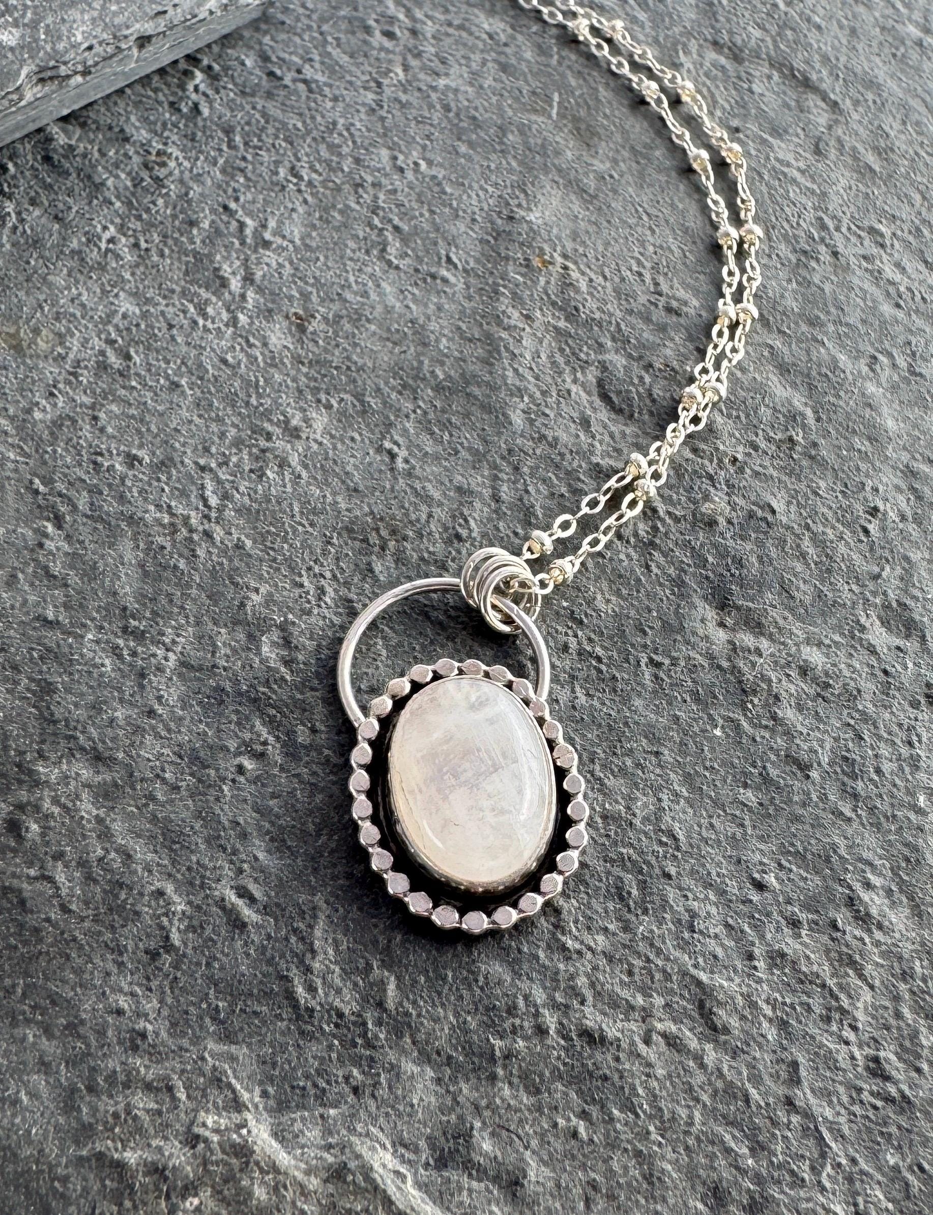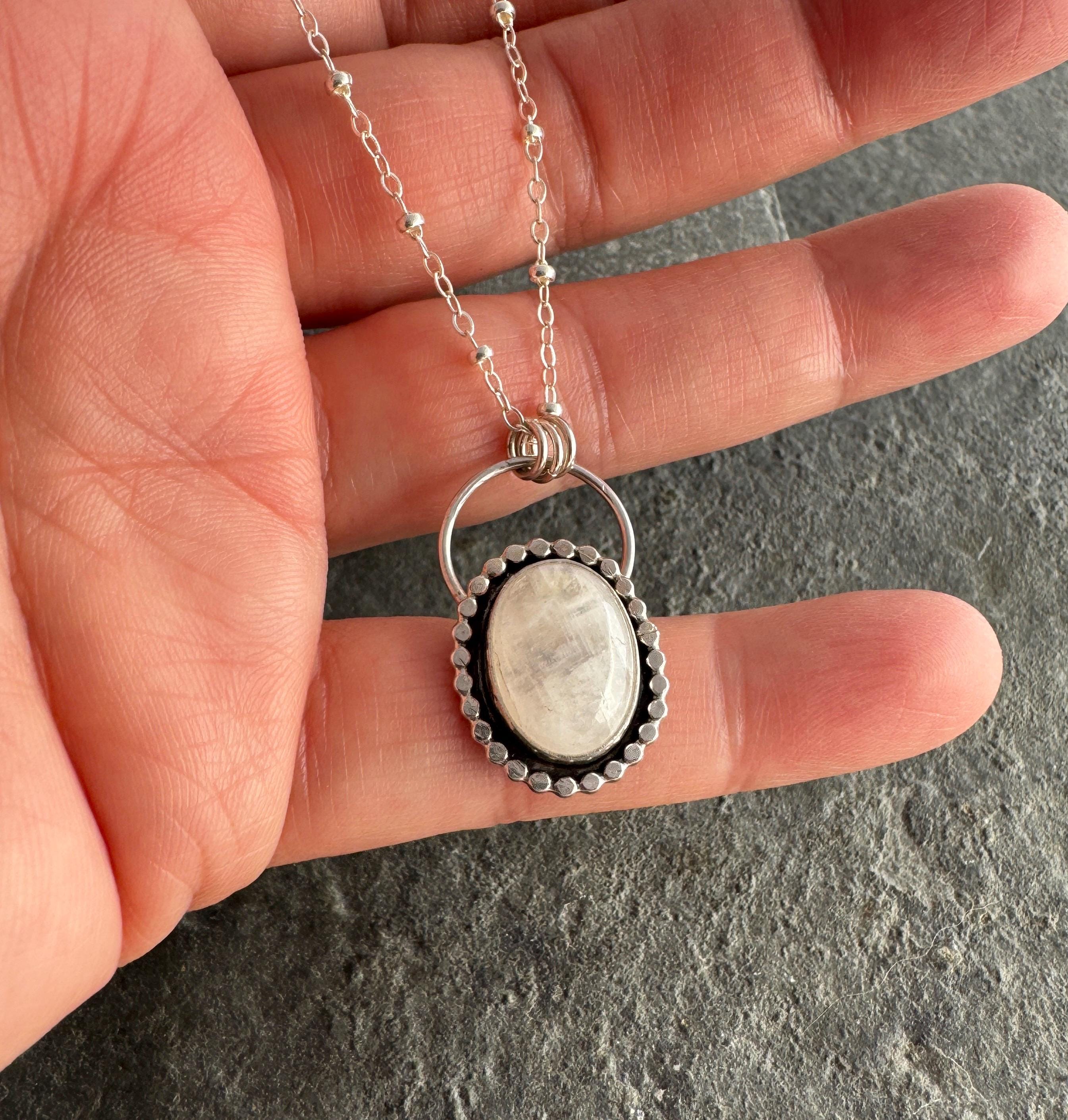 This rainbow moonstone necklace features a glowing flashy rainbow moonstone, surrounded by sterling silver and hanging from a saturn sterling silver chain. The rainbow moonstone gemstone is neutral but not at all boring.